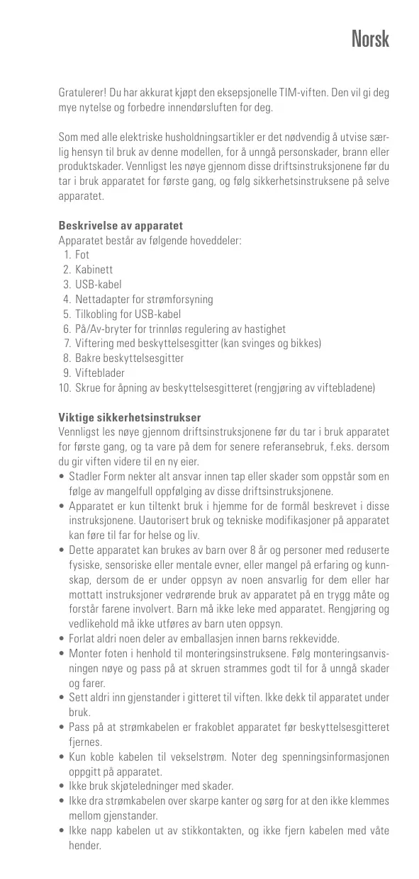 Viktige sikkerhetsinstrukser Vemnligst les noye gjennom driftsinstruksjonene for du tar i bruk apparatet for farste gang, og ta vare pà dem for senere referansebruk, £.eks. dersom du gi viften videre til en ny eier. + Stadler Form nekter alt ansvar innen tap eller skader som oppstär som en falge av mangelful oppfalging av disse driftsinstruksjonene + Apparatet er kun tiltenkt bruk i hjemme for de formäl beskrevet i disse instruksjonene. Uautorisert bruk og tekniske modifikasjoner pà apparatet Kan fore til far for helse og liv Dette apparatet kan brukes av barn over 8 är og personer med reduserte fysiske, sensoriske eller mentale evner, eller mangel pä erfaring og kunn- skap, dersom de er under oppsyn av noen ansvarlig for dem eller har mottatt instruksjoner vedrarende bruk av apparatet pà en trygg mâte og forstär farene invalvert. Barn mà ikke leke med apparatet. Rengjaring og vediikehold mà ikke utfares av barn uten oppsyn. Forlat aldri noen deler av emballasjen innen barns rekkevidde. Monter foten i henhold til monteringsinstruksene. Folg monteringsanvis- ningen naye og pass pä at skruen strammes godt til for à unngà skader og farer. Sett aldri inn gjenstander i gitteret til viften. Ike dekk til apparatet under bruk Pass pà at stramkabelen er frakoblet apparatet for beskyttelsesgitteret fiernes Kun koble kabelen til vekselstram. Noter deg spenningsinformasjonen oppgitt pà apparatet. Ike bruk skjateledninger med skader. Ike dra stremkabelen over skarpe kanter og sorg for at den ikke klemmes mellom gjenstander. + kke napp kabelen ut av stikkontakten, og ikke fjern kabelen med vête hender.