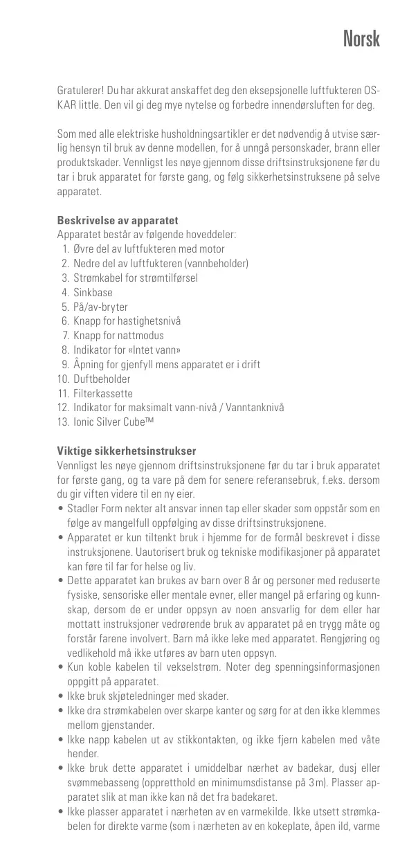 Last ned instruksjonene for din Luftfukter i PDF-format gratis! Finn veiledningen din OSKAR LITTLE TITANIUM - STADLERFORM og ta den elektroniske enheten tilbake i hendene. På denne siden er alle dokumenter som er nødvendige for bruken av enheten din publisert. OSKAR LITTLE TITANIUM av merket STADLERFORM.