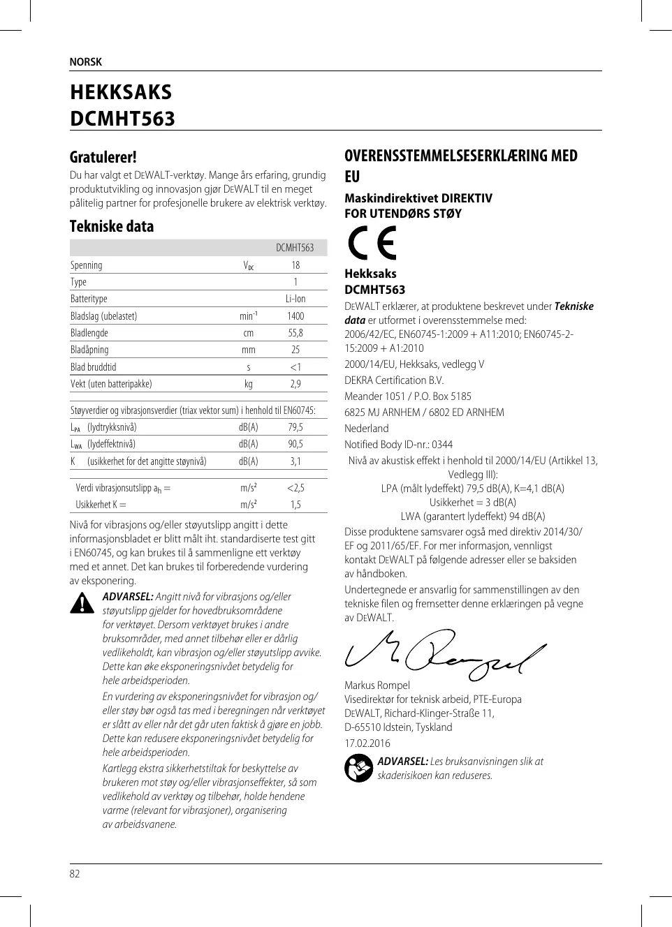 DCMHT563 Le soussigné est responsable de la compilation du fichier technique et fait cette déclaration au nom de DEWALT.