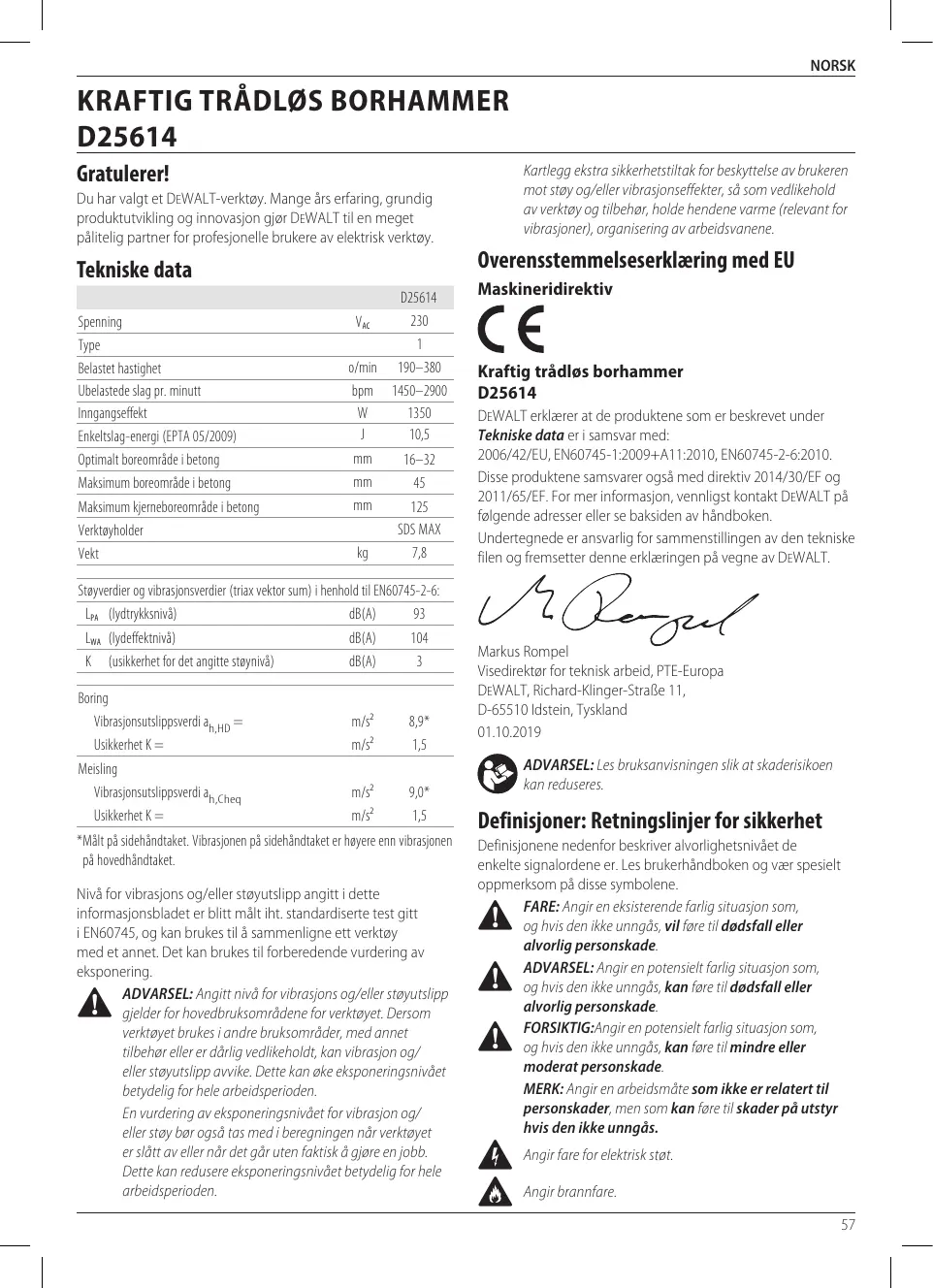 Le soussigné est responsable de la compilation du fichier technique et fait cette déclaration au nom de DEWALT.