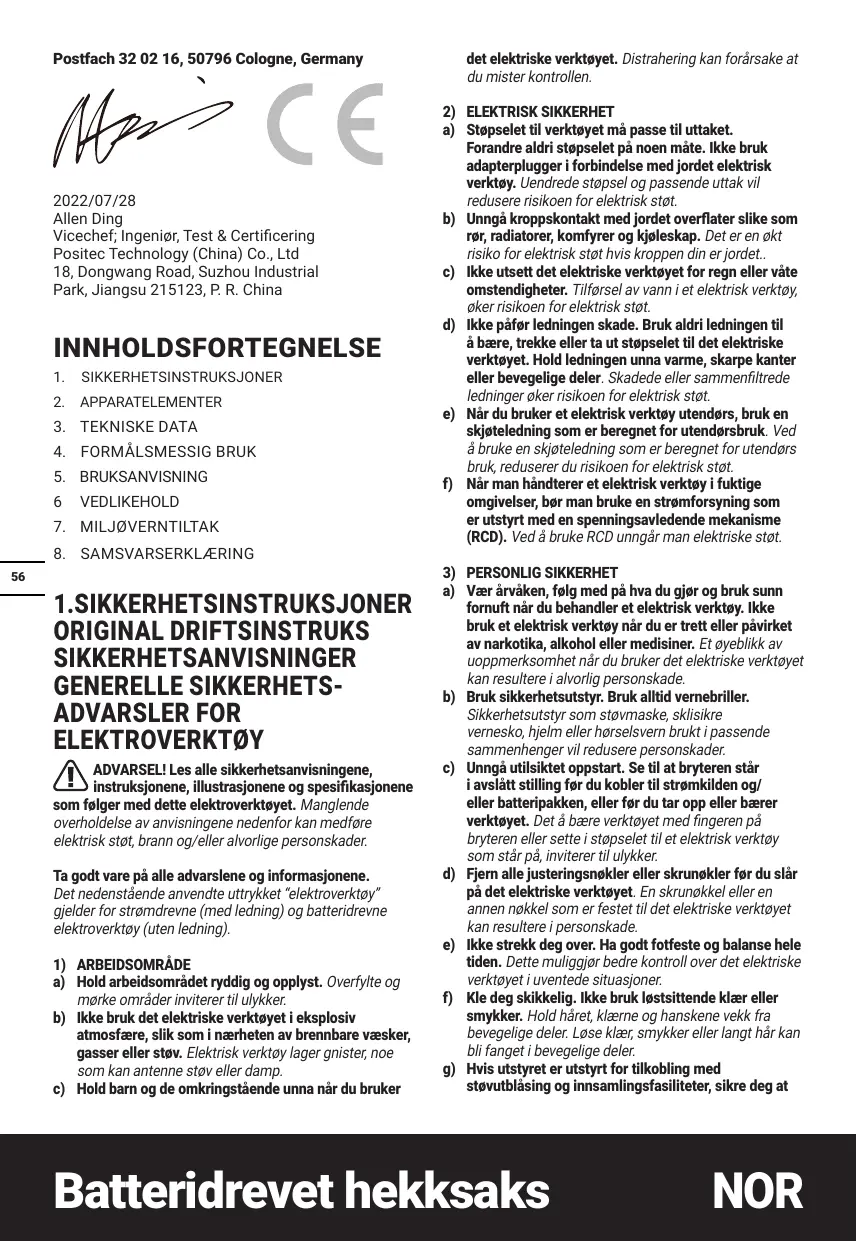 Nome Marcel Filz Endereço_ Positec Germany GmbH Postfach 32 02 16, 50796 Cologne, Germany De conditie en de onderhoudstoestand van de machine. Gebruik van de juiste toebehoren. Zorg ervoor dat ze scherp zijn en in goede conditie. Hoe stevig de handgreep wordt vastgehouden en of er antHtrlling en -geluidsaccessoires worden gebruikt. De machine moet gebruik worden zoals door de ontwerper bedoeld is en in overeenstemming met deze instructies.