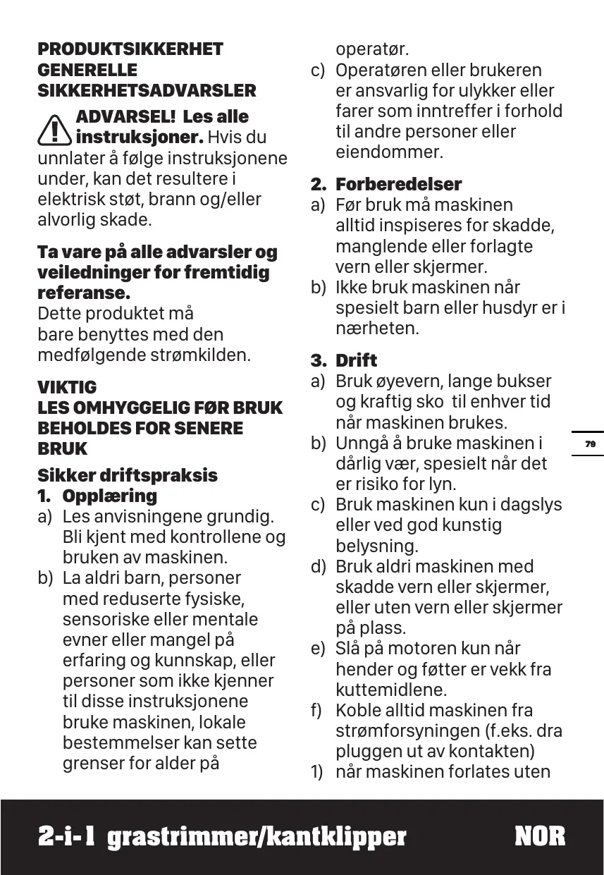 épais. Tenir la poignée frontale d'une main et la poignée auxiliaire de l'autre. Maintenir l'appareil au-dessous du niveau de la ceinture. Travailler uniquement de droit à gauche afin de s'assurer que les débris ne sont pas projetés en direction de l'opérateur. Sans se pencher, maintenir le fil à proximité du sol et parallèle à celui-ci (perpendiculaire lors de la coupe des bordures) et non appuyé sur la surface à tondre.