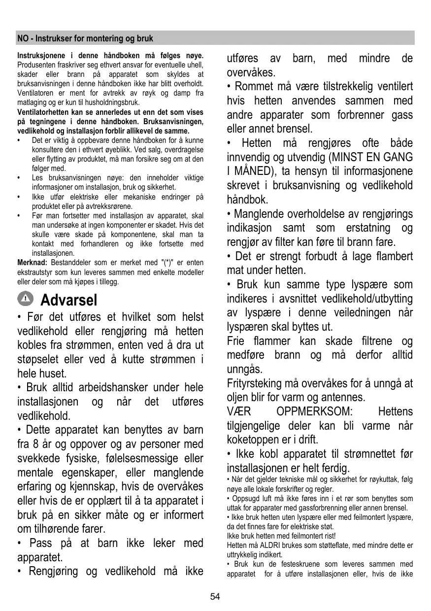 + La pièce doit avoir une aération suffisante lorsque la hotte est utilisée conjointement avec d'autres appareils fonctionnant au gaz ou autres combustibles.