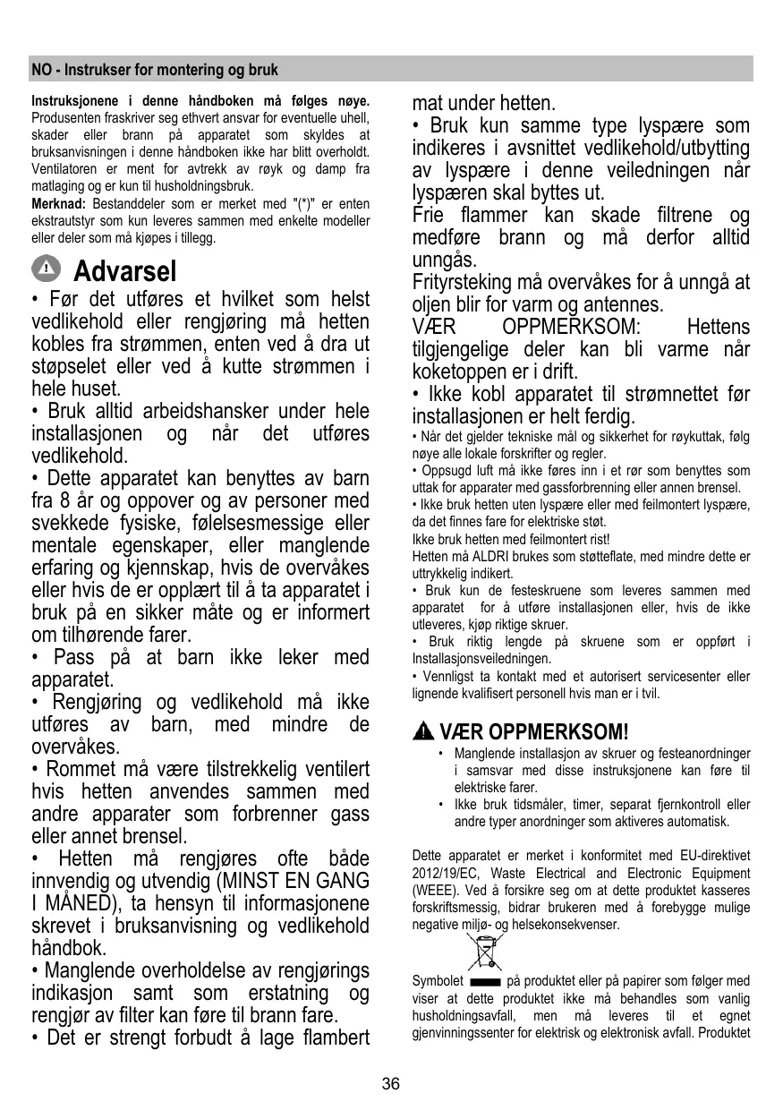 + La hotte ne doit JAMAIS être utilisée comme une surface d'appui, sauf indication expresse.
