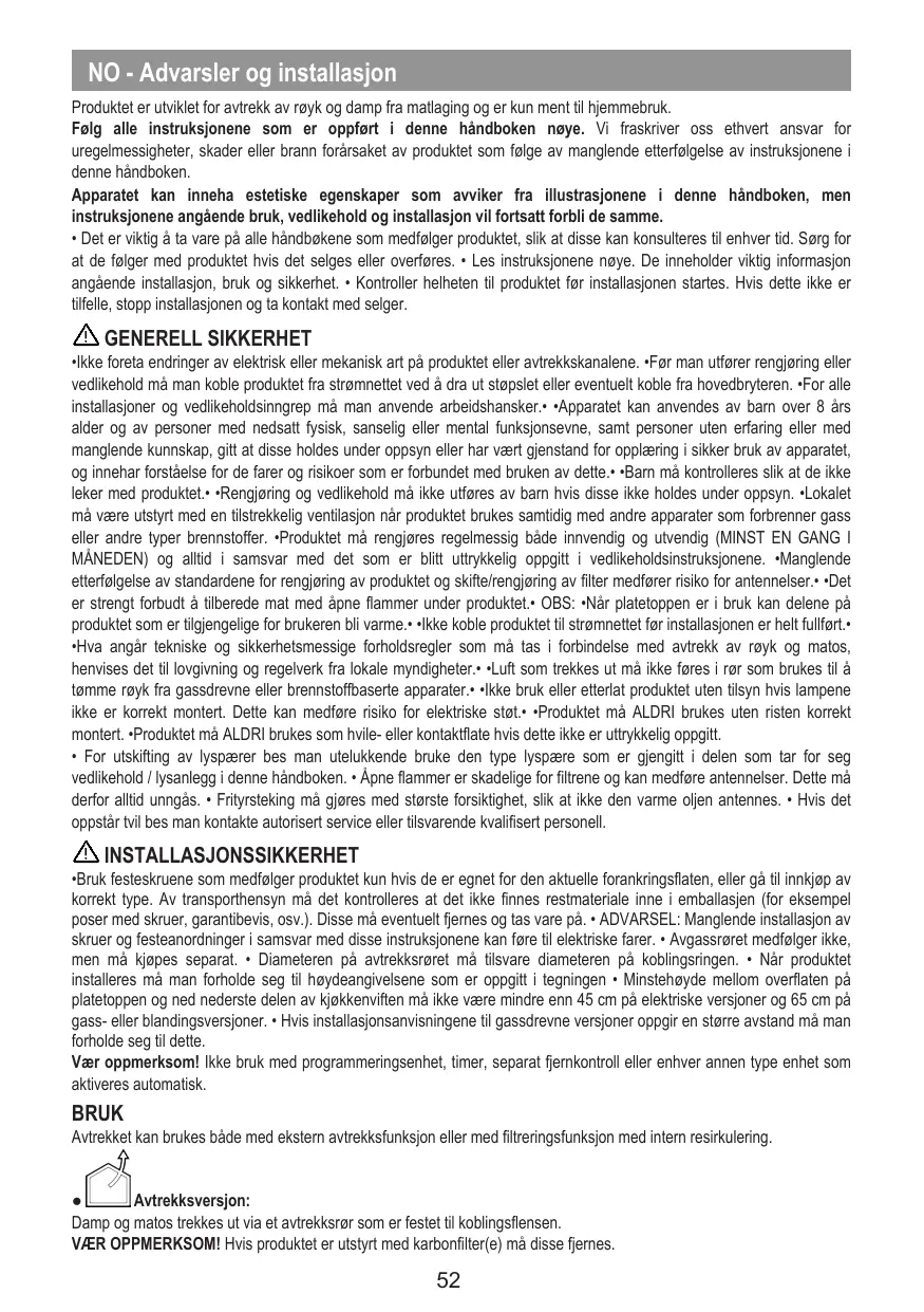 Stictement interdit de faire flamber des aliments sous le produit.» ATTENTION : Lorsque la plaque de cuisson est en marche, les paries accessibles du produit peuvent devenir chaudes.+ Ne pas brancher le produit au secteur électrique tant que l'installation n'est pas totalement terminée.+ Concemant les mesures techniques et de sécurité à prendre pour l'évacuation des fumées, respecter scrupuleusement les règlementations établies par les autorités locales compétentes.» L'air aspiré ne doi pas être conduit vers le tube destiné à l'évacuation des fumées des appareils à combustion à gaz où autres combustibles.» Ne pas utiliser ni laisser le produit sans que les ampoules ne soient correctement montées en raison du risque possible de décharge électrique. Le produit ne doit JAMAIS être utilisé sans la grille correctement montée. + Le produit ne doit JAMAIS être utlisé comme plan à moins que cela ne soit explicitement indiqué.