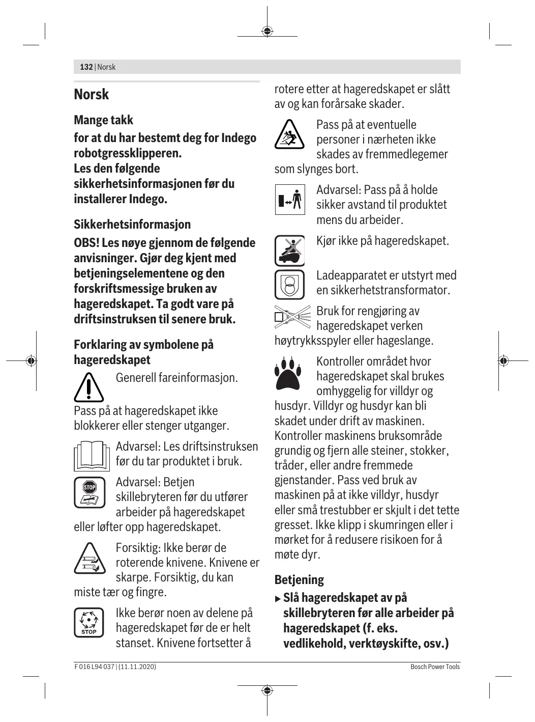 : Estado del sistema Informaciones sobre el estado de carga del acumulador, informa- ciones sobre el sistema y tiempos de servicioÿ de carga del corta- césped. Informaciones F016 L94 037 (11.11.2020) Bosch Power Tools