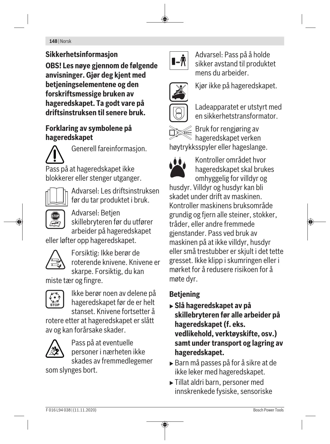 > Veillez à assurer un équilibre et une position stable quand vous travaillez avec ou à proximité de l'outil de jar- din, surtout sur pentes et gazon hu- mide. Ne vous penchez pas trop en avant. Utilisez l'outil avec prudence et sans hâte.