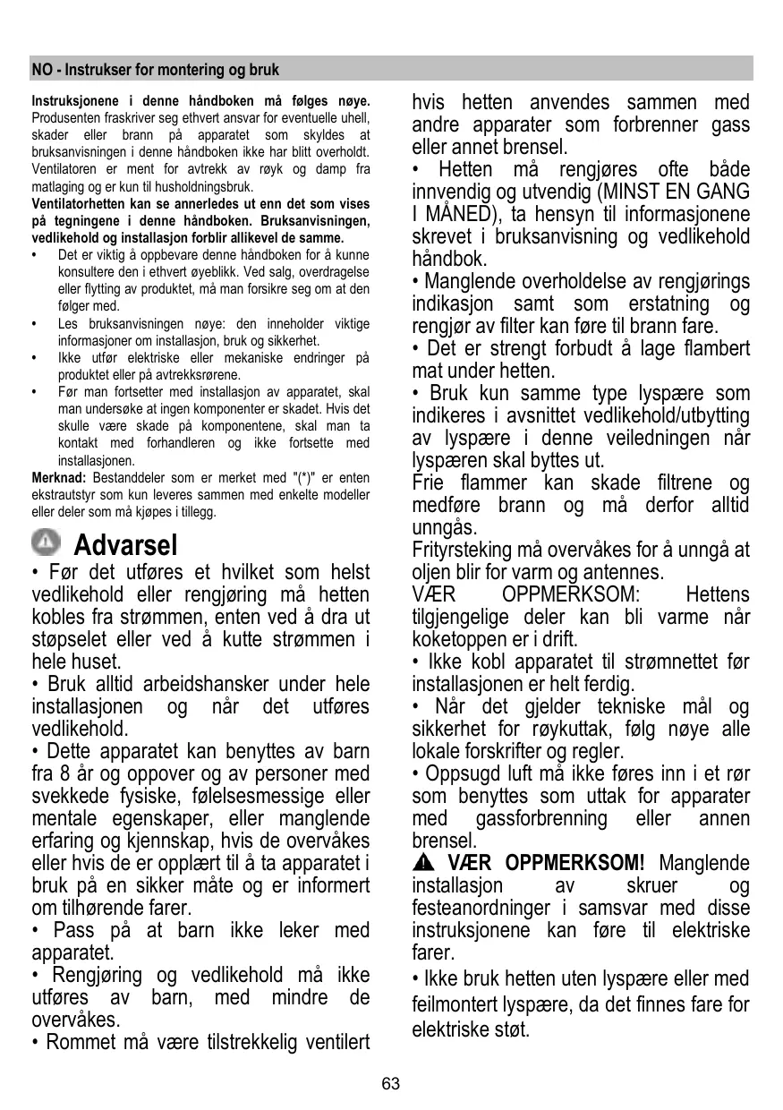+ La hotte ne doit JAMAIS être utilisée comme une surface d'appui, sauf indication expresse.