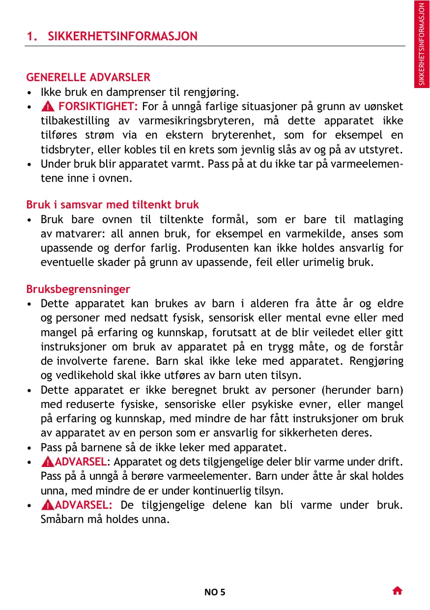 Bruk bare ovnen til tiltenkte formäl, som er bare til matlaging av matvarer: all annen bruk, for eksempel en varmekilde, anses som upassende og derfor farlig. Produsenten kan ikke holdes ansvarlig for eventuelle skader pà grunn av upassende, feil eller urimelig bruk.