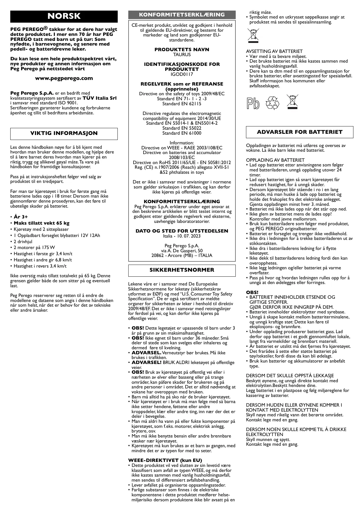 Retrouvez gratuitement la notice de l'appareil Taurus PEG PEREGO au format PDF.