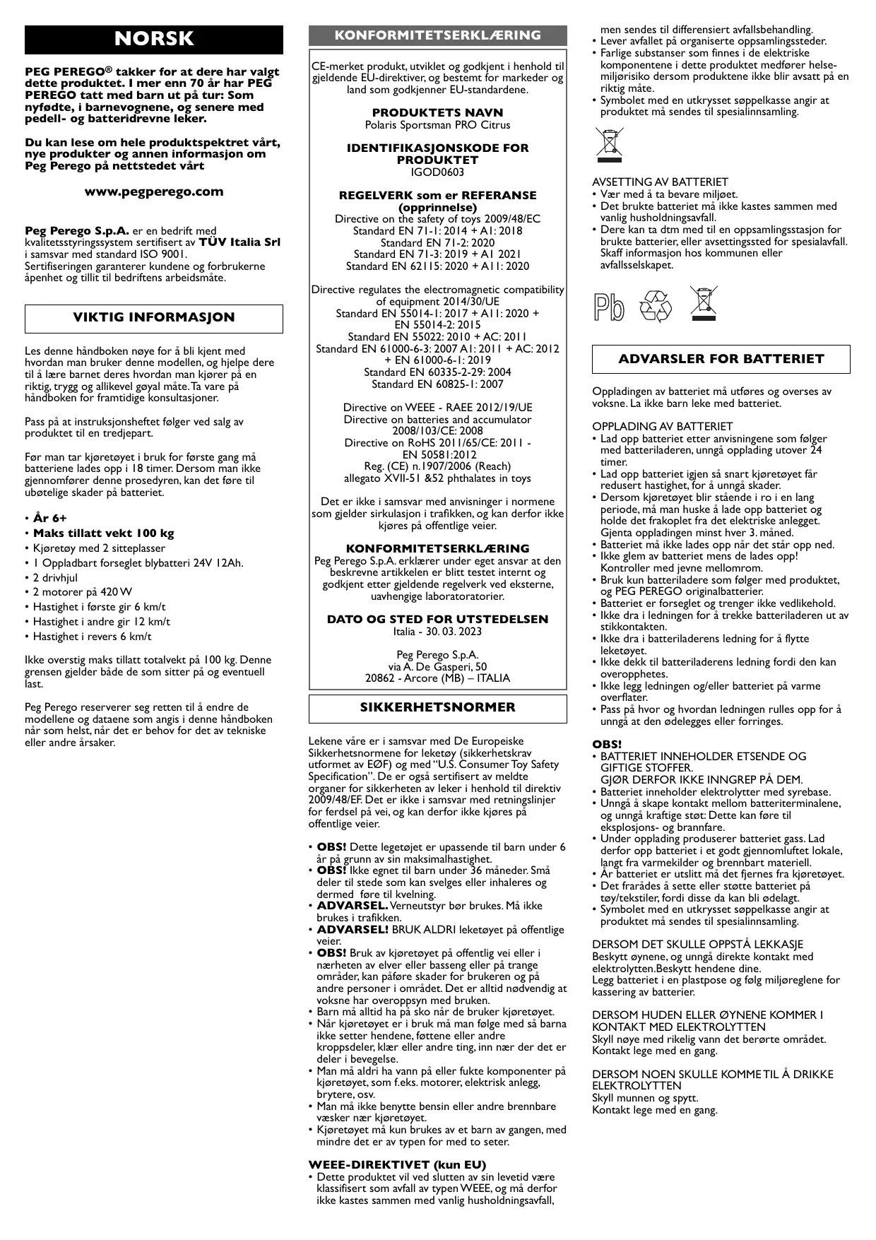 BRUKSANVISNING Polaris SPORTSMAN PRO Citrus PEG PEREGO