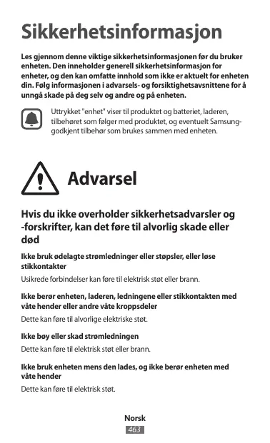 Sikkerhetsinformasjon Les gjennom denne viktige sikkerhetsinformasjonen før du bruker enheten. Den inneholder generell sikkerhetsinformasjon for enheter, og den kan omfatte innhold som ikke er aktuelt for enheten din. Følg informasjonen i advarsels- og forsiktighetsavsnittene for å unngå skade på deg selv og andre og på enheten. Uttrykket "enhet" viser til produktet og batteriet, laderen, tilbehøret som følger med produktet, og eventuelt Samsunggodkjent tilbehør som brukes sammen med enheten. Advarsel Hvis du ikke overholder sikkerhetsadvarsler og -forskrifter, kan det føre til alvorlig skade eller død Ikke bruk ødelagte strømledninger eller støpsler, eller løse stikkontakter Usikrede forbindelser kan føre til elektrisk støt eller brann. Ikke berør enheten, laderen, ledningene eller stikkontakten med våte hender eller andre våte kroppsdeler Dette kan føre til alvorlige elektriske støt. Ikke bøy eller skad strømledningen Dette kan føre til elektrisk støt eller brann. Ikke bruk enheten mens den lades, og ikke berør enheten med våte hender Dette kan føre til elektrisk støt. Norsk