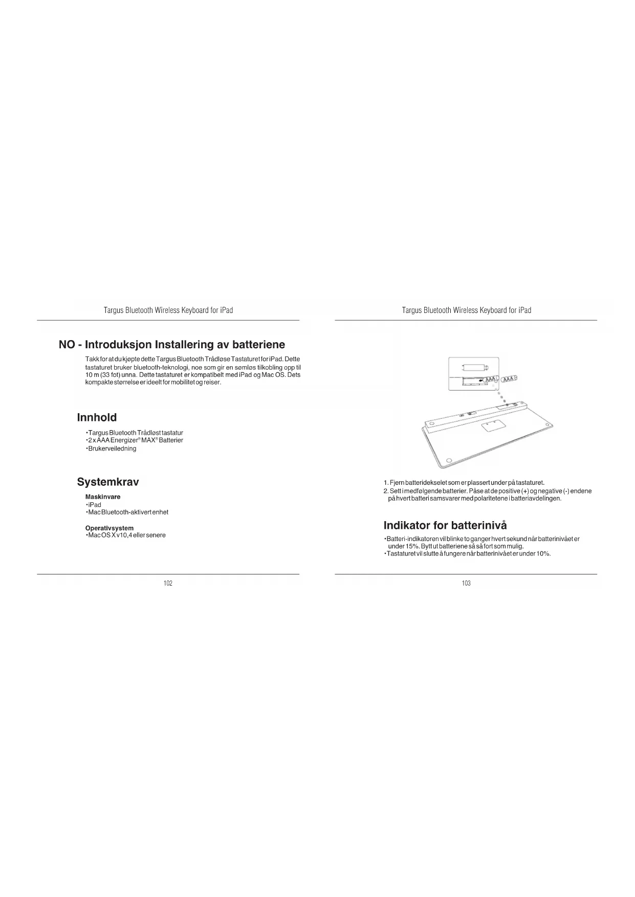 Funksjon Hjem-skjerm Søk iPad vil gå til Bilderamme-modus. Vis og skjul tastaturet på displayetSpol tilbake eller gå til foregående sang, lm eller lysbilde-fremvisningSpol fremover eller går til neste sang, lm eller lysbildefrem-visningSpill av eller pause sanger, lmer eller lysbildefremvisningerDemp lyden på din iPadSenk volumet på din iPadØk volumet på din iPadLås displayet Bluetooth-tilkoblig: Mac 1. Gå til Bluetooth-ikonet på skrivebordet eller i systemlinjen og klikk på ikonet for å starte oppsettet. Velg “Turn Bluetooth On” (Skru på Bluetooth) for å aktivere Bluetooth-funksjonen på din Mac.2. Rull ned på listen og velg “Set up Bluetooth Device... (Sett opp Bluetooth-enhet…).3. Bluetooth-oppsettet vil starte. Følg instruksjonene på skjermen.4. Velg “keyboard” (Tastatur) og klikk “Continue” (Fortsett) for å fortsette oppsettet. Tastaturet må være i oppdage-modus for å koble til.5. Trykk Connect (Koble til)-knappen på baksiden på tastaturet for å aktivere oppdage-modus. Indikatoren for lavt batterinivå vil blinke blått når tastaturet er i oppdage-modus.6. PCen din vil starte søket etter tastaturet. Når tastaturet er funnet, vil den vise listen. Fremhev “Bluetooth Keyboard” (Bluetooth-tastatur), og trykk “Continue” (Fortsett).7. Tastaturet vil nå starte paringen. Klikk Continue (Fortsett).8. Gratulerer. Ditt tastatur er nå satt opp og klart til bruk. Du kan velge å sette opp en annen enhet eller klikke Quit (Avslutt) for å gå ut av oppsettet.Targus Bluetooth Wireless Keyboard for iPad