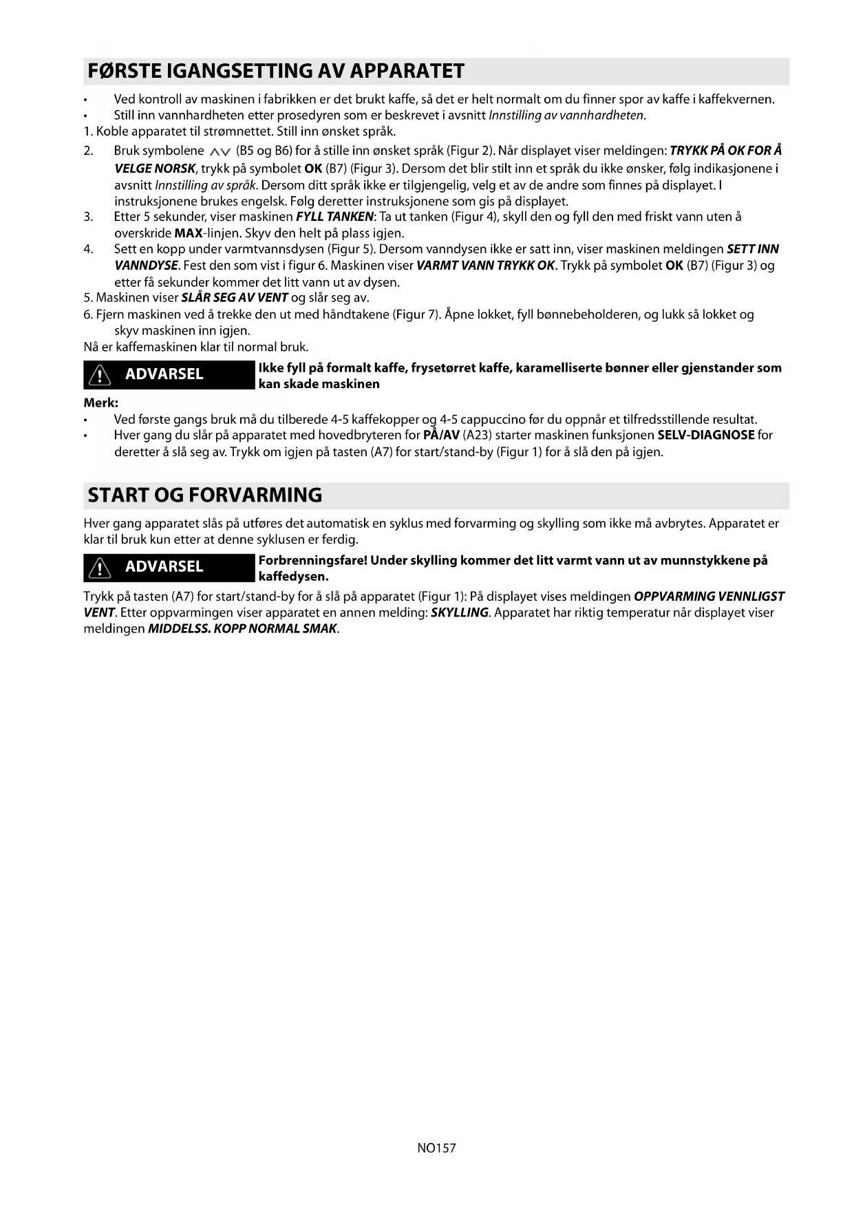 - Hver gang du slår på apparatet med hovedbryteren for PÅ/AV (A23) starter maskinen funksjonen SELV-DIAGNOSE for deretter å slå seg av. Trykk om igjen på tasten (A7) for start/stand-by (Figur 1) for å slå den på igjen. Hver gang apparatet slås på utføres det automatisk en syklus med forvarming og skylling som ikke må avbrytes. Apparatet er klar til bruk kun etter at denne syklusen er ferdig. Trykk på tasten (A7) for start/stand-by for å slå på apparatet (Figur 1): På displayet vises meldingen OPPVARMING VENNLIGST VENT. Etter oppvarmingen viser apparatet en annen melding: SKYLLING. Apparatet har riktig temperatur når displayet viser meldingen MIDDELSS. KOPP NORMAL SMAK.