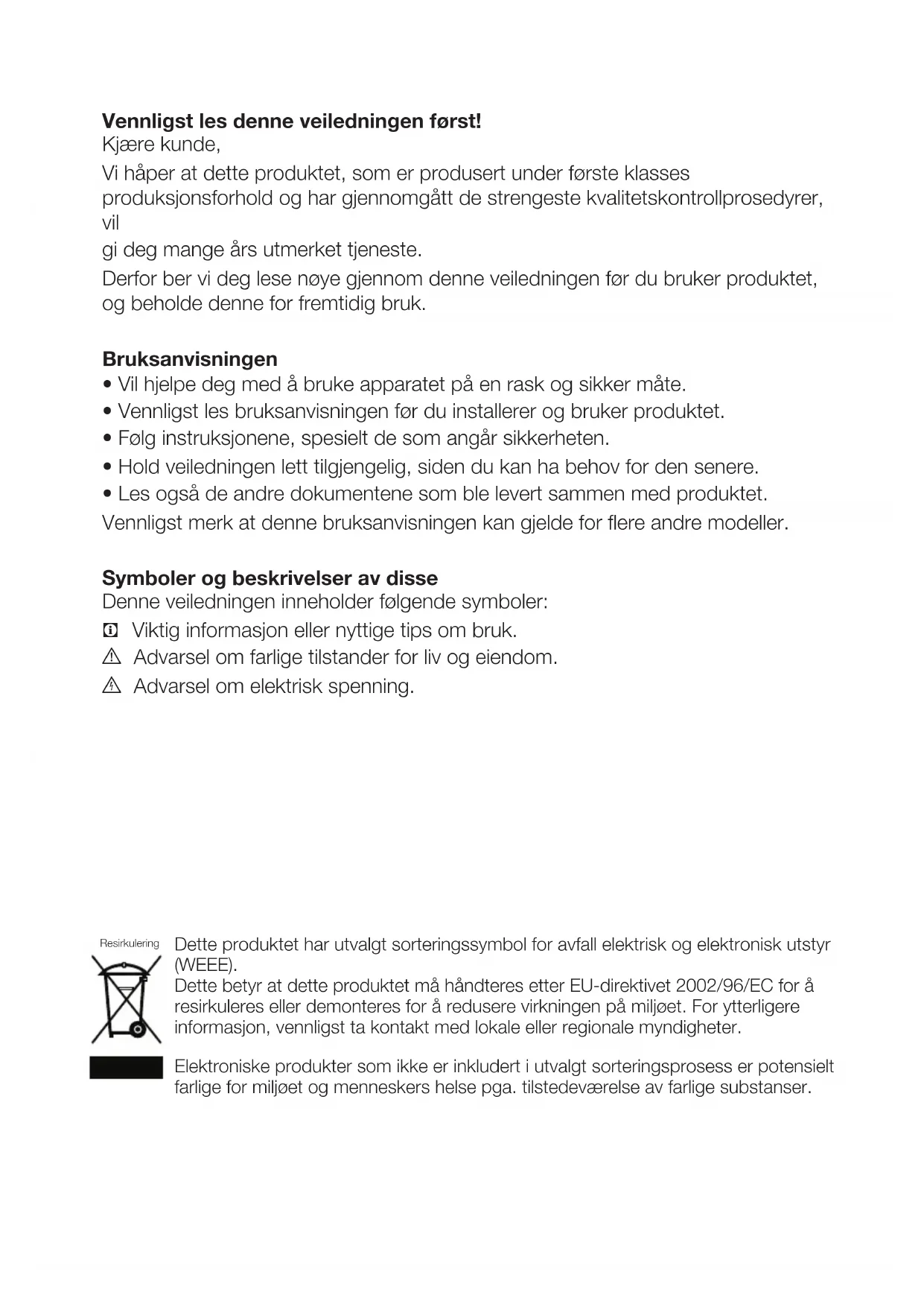 Dette betyr at dette produktet må håndteres etter EU-direktivet 2002/96/EC for å