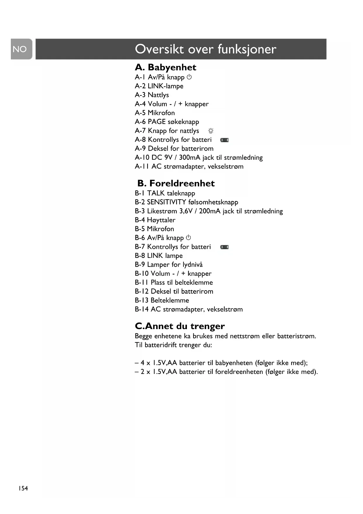 – 4 x AA 1,5 V Alkaliske batterier for babyenheten (følger ikke