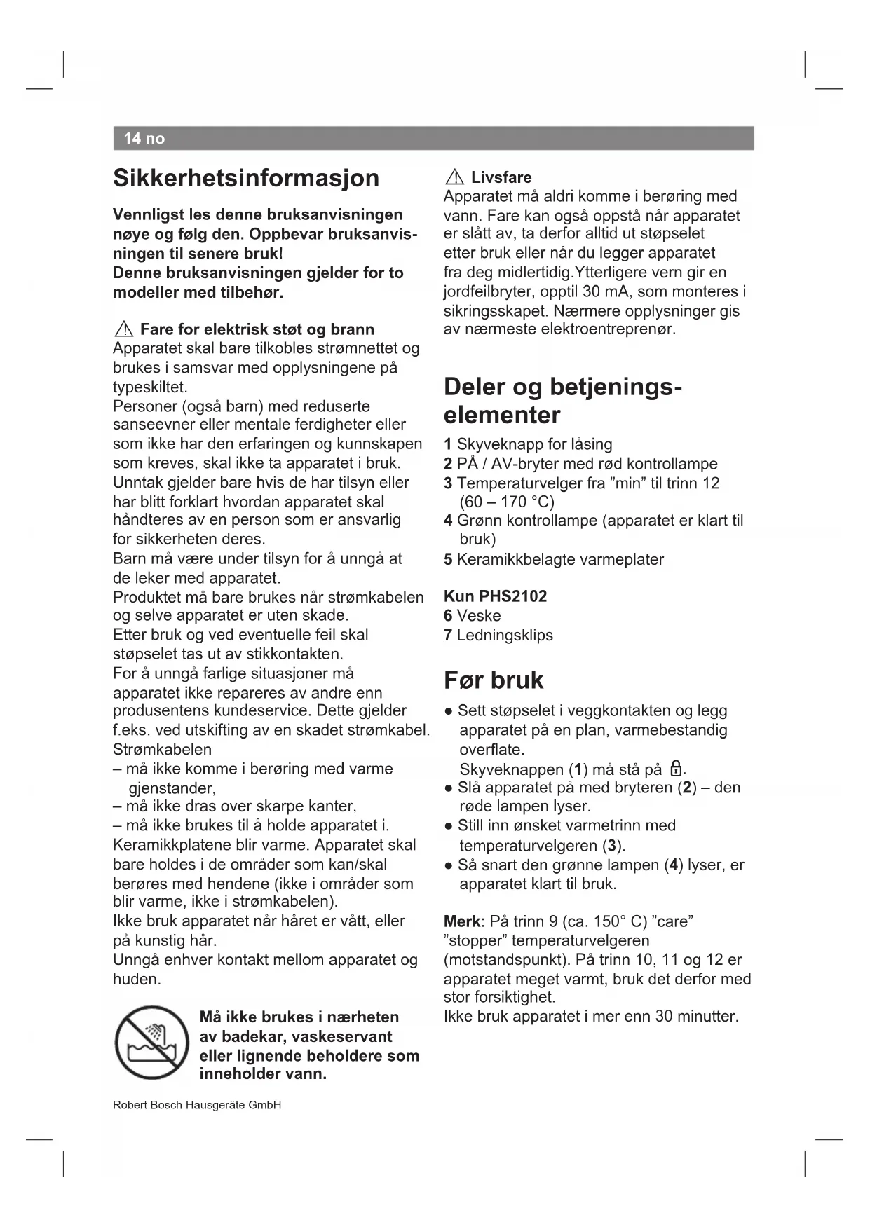 Livsfare Apparatet må aldri komme i berøring med vann. Fare kan også oppstå når apparatet er slått av, ta derfor alltid ut støpselet etter bruk eller når du legger apparatet fra deg midlertidig.Ytterligere vern gir en jordfeilbryter, opptil 30 mA, som monteres i sikringsskapet. Nærmere opplysninger gis av nærmeste elektroentreprenør. Deler og betjenings- elementer 1 Skyveknapp for låsing 2 PÅ / AV-bryter med rød kontrollampe 3 Temperaturvelger fra ”min” til trinn 12 (60 – 170 °C) 4 Grønn kontrollampe (apparatet er klart til bruk) 5 Keramikkbelagte varmeplater Kun PHS2102 6 Veske 7 Ledningsklips Før bruk