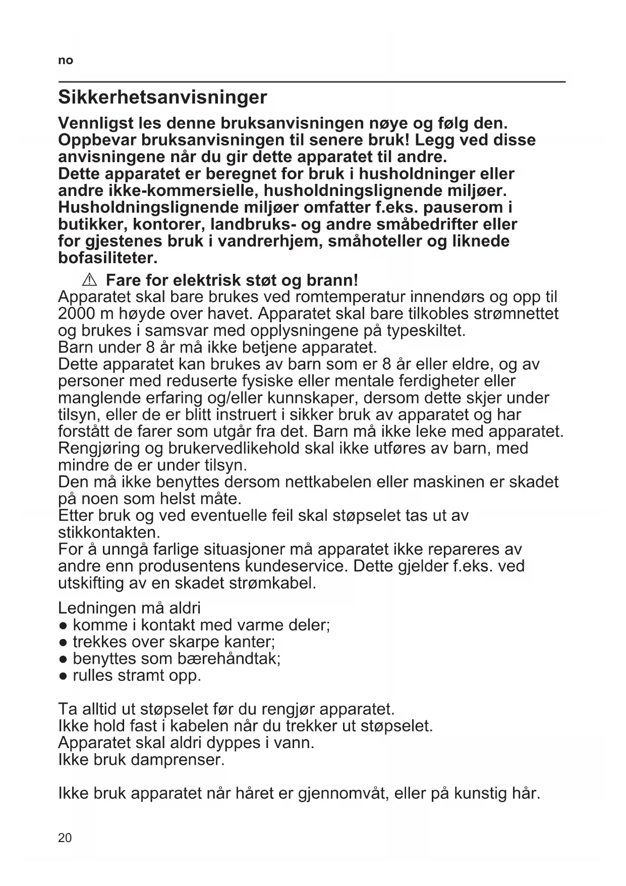 Sikkerhetsanvisninger Vennligst les denne bruksanvisningen nøye og følg den. Oppbevar bruksanvisningen til senere bruk! Legg ved disse anvisningene når du gir dette apparatet til andre. Dette apparatet er beregnet for bruk i husholdninger eller andre ikke-kommersielle, husholdningslignende miljøer. Husholdningslignende miljøer omfatter f.eks. pauserom i butikker, kontorer, landbruks- og andre småbedrifter eller for gjestenes bruk i vandrerhjem, småhoteller og liknede bofasiliteter. A Fare for elektrisk støt og brann! Apparatet skal bare brukes ved romtemperatur innendørs og opp til 2000 m høyde over havet. Apparatet skal bare tilkobles strømnettet og brukes i samsvar med opplysningene på typeskiltet. Barn under 8 år må ikke betjene apparatet. Dette apparatet kan brukes av barn som er 8 år eller eldre, og av personer med reduserte fysiske eller mentale ferdigheter eller manglende erfaring og/eller kunnskaper, dersom dette skjer under tilsyn, eller de er blitt instruert i sikker bruk av apparatet og har forstått de farer som utgår fra det. Barn må ikke leke med apparatet. Rengjøring og brukervedlikehold skal ikke utføres av barn, med mindre de er under tilsyn. Den må ikke benyttes dersom nettkabelen eller maskinen er skadet på noen som helst måte. Etter bruk og ved eventuelle feil skal støpselet tas ut av stikkontakten. For å unngå farlige situasjoner må apparatet ikke repareres av andre enn produsentens kundeservice. Dette gjelder f.eks. ved utskifting av en skadet strømkabel. Ledningen må aldri ● komme i kontakt med varme deler; ● trekkes over skarpe kanter; ● benyttes som bærehåndtak; ● rulles stramt opp. Ta alltid ut støpselet før du rengjør apparatet. Ikke hold fast i kabelen når du trekker ut støpselet. Apparatet skal aldri dyppes i vann. Ikke bruk damprenser. Ikke bruk apparatet når håret er gjennomvåt, eller på kunstig hår.21