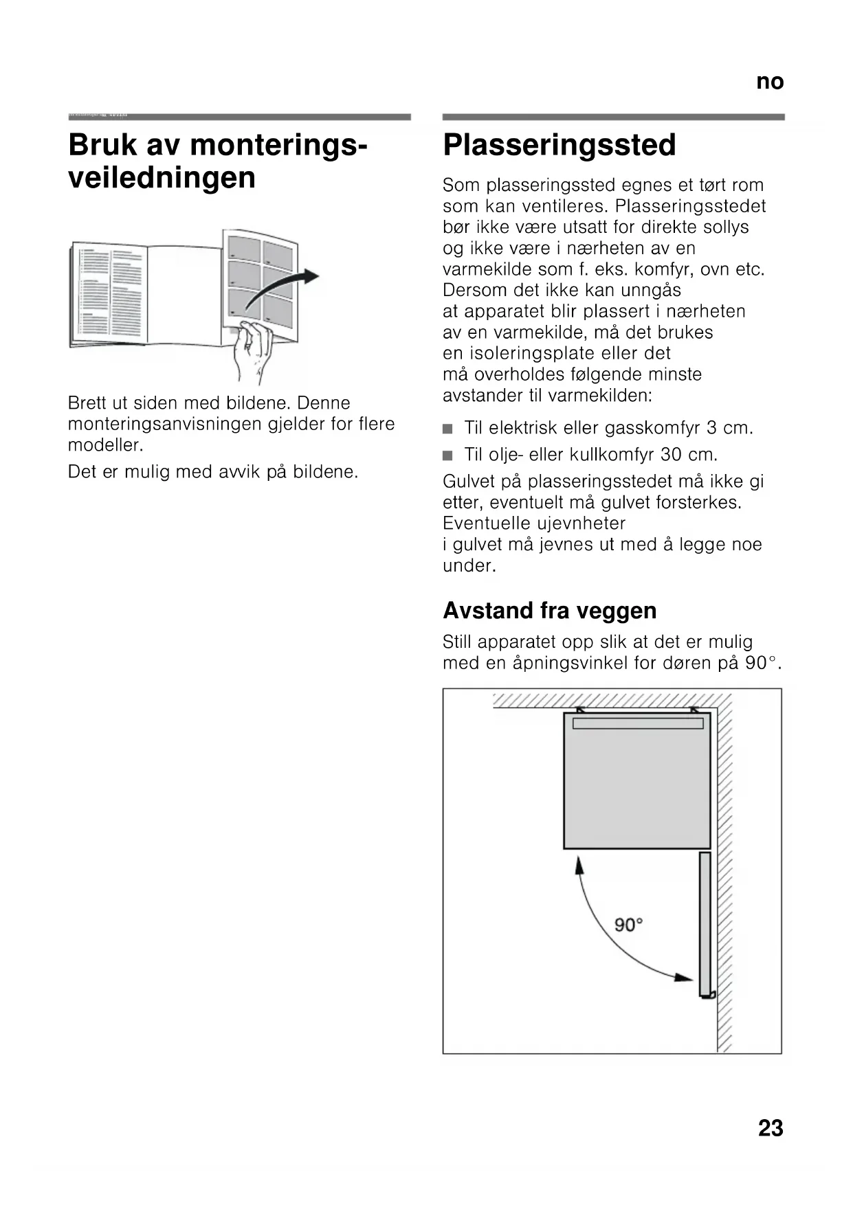 med en åpningsvinkel for døren på 90°.no