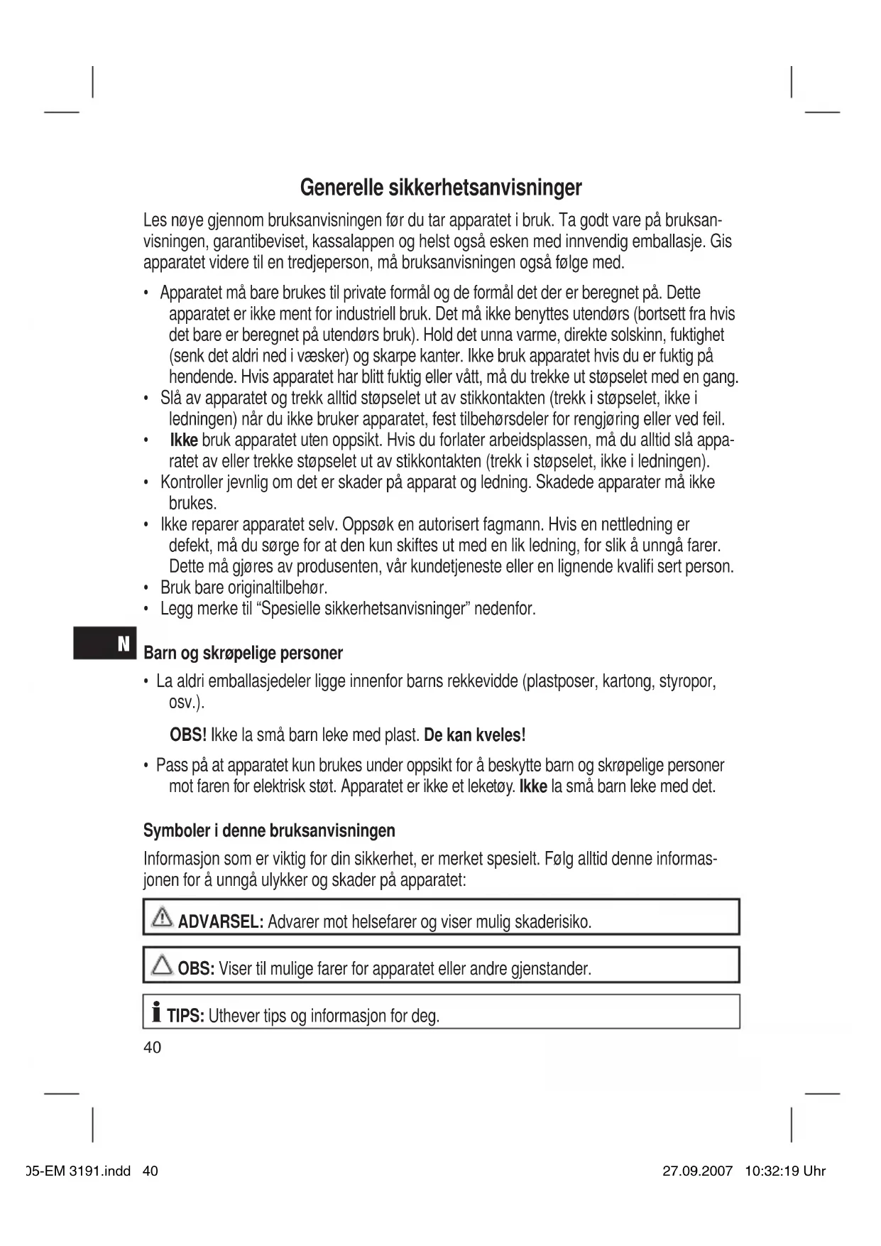 - Pass på at apparatet kun brukes under oppsikt for å beskytte barn og skrøpelige personer mot faren for elektrisk støt. Apparatet er ikke et leketøy. Ikke la små barn leke med det. Symboler i denne bruksanvisningen Informasjon som er viktig for din sikkerhet, er merket spesielt. Følg alltid denne informas- jonen for å unngå ulykker og skader på apparatet: ADVARSEL: Advarer mot helsefarer og viser mulig skaderisiko. OBS: Viser til mulige farer for apparatet eller andre gjenstander. TIPS: Uthever tips og informasjon for deg. 05-EM 3191.indd 4005-EM 3191.indd 40 27.09.2007 10:32:19 Uhr27.09.2007 10:32:19 UhrN