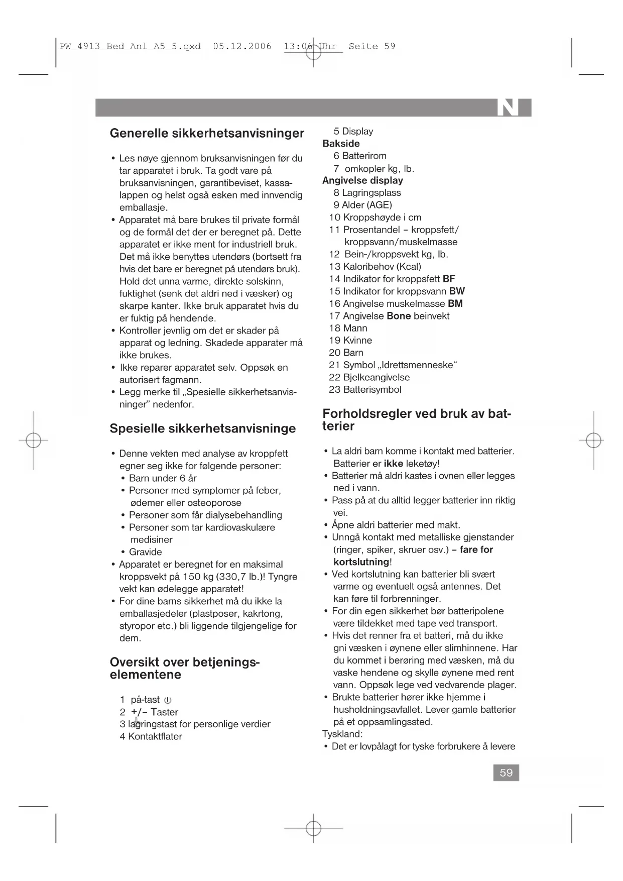 - En må ikke bruke ulike batterityper eller nye og brukte batterier sammen. OBS: Batterier hører ikke hjemme i husholdningsavfallet. Brukte batterier skal leveres på ansvarlige oppsamlingssteder eller hos en forhandler. Kast aldri batterier i ovnen. Batterirom (undersiden av vekten) De to batteriene i batterirommet er transportsikret med en plastfi lm. Dette forlenger batterienes levetid. Fjern plastfi lmen før første gangs bruk. Informasjon om måling av kroppsfett Personer som bruker en hjertestimulator eller et annet medisinisk implantat med elektroniske komponenter, frarådes fra å bruke denne vekten. Den kan påvirke eller sette implantatets funksjoner i fare. Apparatet fungerer bare riktig når du står barbeint med tørre føtter på kontaktfl atene! Det grunnleggende prinsippet for apparatet går ut på å måle kroppens elektriske impedans. Apparatet sender et svakt, umerkelig elektrisk signal gjennom kroppen din og fi nner deretter de aktuelle verdiene for deg. Signalet er normalt helt ufarlig! Se likevel våre spesielle sikkerhetsinstrukser! Denne formen for måling er kjent under begrepet ”bioelektrisk impedansanalyse” (BIA), en faktor som henger sammen med både fett- og vannandelen i kroppen samt med andre biologiske data (alder, kjønn, kroppshøyde). Det finnes tunge mennesker som har et balansert forhold mellom fett- og muskel- masse, og det finnes tilsynelatende slanke mennesker med klart forhøyede kroppsfett- verdier. Fett er en faktor som bidrar sterkt til å belaste organismen, særlig hjerte-kar- systemet. Derfor er det en grunnleggende forutsetning for helse og sunnhet å kontrollere begge verdiene (både fett og vekt). Kroppsfett Kroppsfett er en viktig del av organismen. Fett har en viktig oppgave i kroppen, fra å beskytte leddene og lagre vitaminer til å regulere kroppstemperaturen. Målet er altså ikke å redusere fettandelen radikalt, men å oppnå og opprettholde et balansert forhold mellom muskelmasse og fettmasse. PW_4913_Bed_Anl_A5_5.qxd 05.12.2006 13:06 Uhr Seite 6061