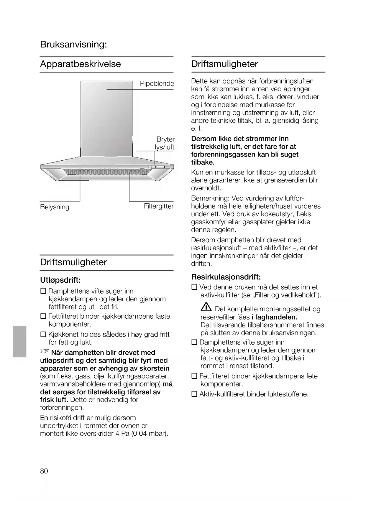 Når damphetten blir drevet med utløpsdrift og det samtidig blir fyrt med apparater som er avhengig av skorstein (som f.eks. gass, olje, kullfyringsapparater, varmtvannsbeholdere med gjennomløp) må det sørges for tilstrekkelig tilførsel av frisk luft. Dette er nødvendig for forbrenningen. En risikofri drift er mulig dersom undertrykket i rommet der ovnen er montert ikke overskrider 4 Pa (0,04 mbar). Dette kan oppnås når forbrenningsluften kan få strømme inn enten ved åpninger som ikke kan lukkes, f. eks. dører, vinduer og i forbindelse med murkasse for innstrømning og utstrømning av luft, eller andre tekniske tiltak, bl. a. gjensidig låsing e. l. Dersom ikke det strømmer inn tilstrekkelig luft, er det fare for at forbrenningsgassen kan bli suget tilbake. Kun en murkasse for tilløps- og utløpsluft alene garanterer ikke at grenseverdien blir overholdt. Bemerkning: Ved vurdering av luftfor- holdene må hele leiligheten/huset vurderes under ett. Ved bruk av kokeutstyr, f.eks. gasskomfyr eller gassplater gjelder ikke denne regelen. Dersom damphetten blir drevet med resirkulasjonsluft – med aktivfilter –, er det ingen innskrenkninger når det gjelder driften. Skal avluften ledes gjennom ytter- veggen, bør det brukes en teleskop- murboks. Utløpsdrift