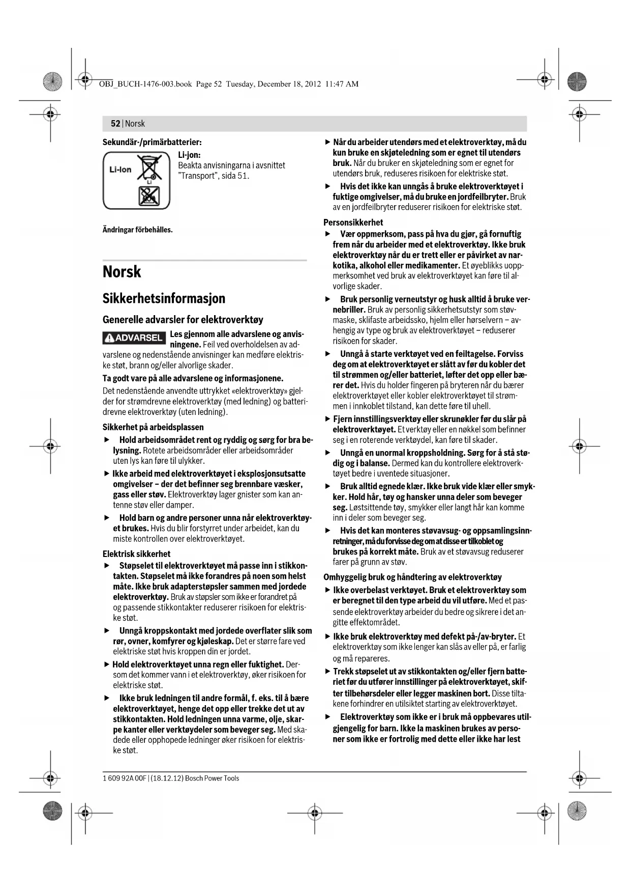 Li-ion-batteriene i verktøyet underligger kravene for farlig