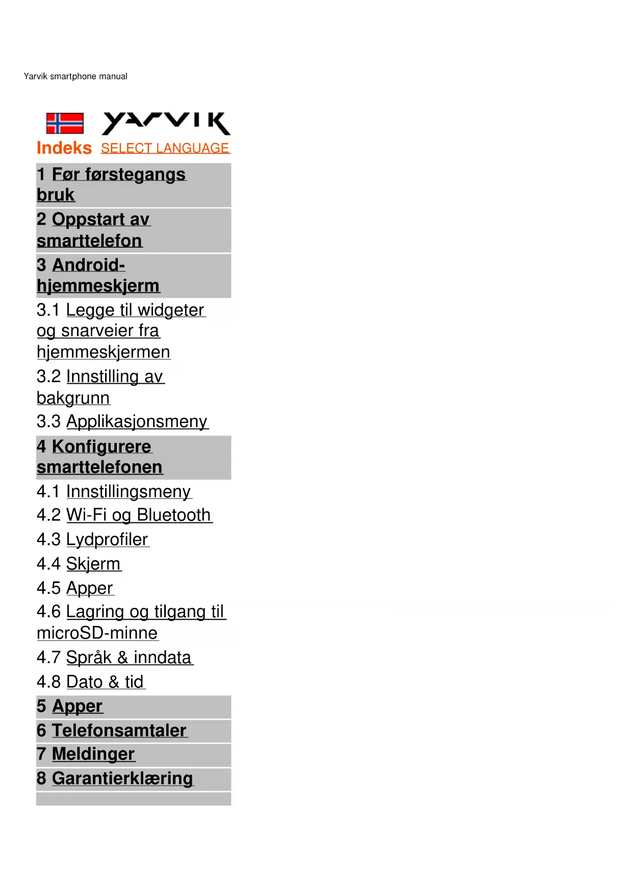 - Bruk av smarttelefonen med hodetelefoner for lenge eller med for høyt volum kan føre til alvorlig hørselsskade.Yarvik smartphone manual file:///Users/elroy/Desktop/Yarvik/Manual/manual_no.html[08-10-13 11:25:30]