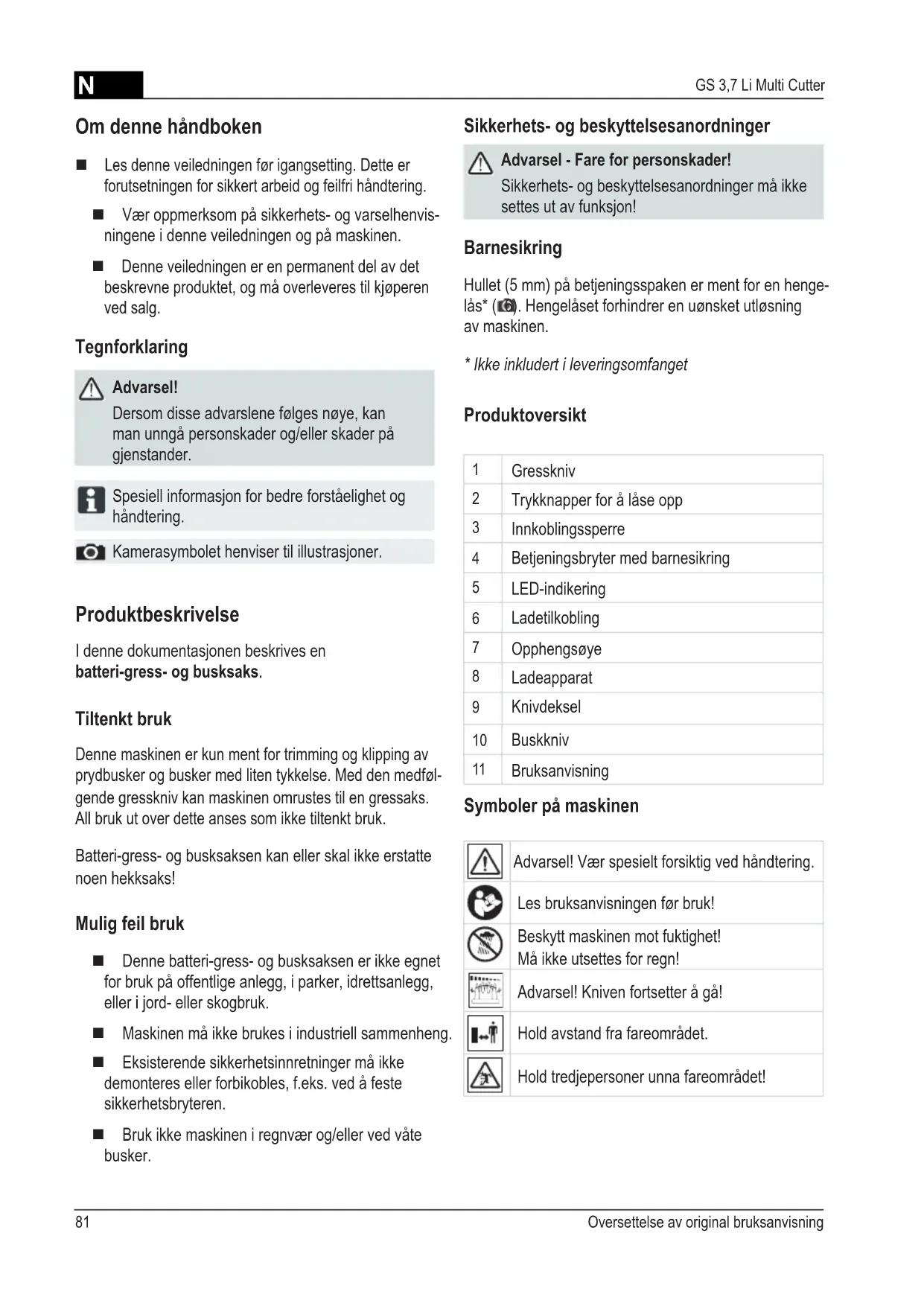 1)N Oversettelse av original bruksanvisning