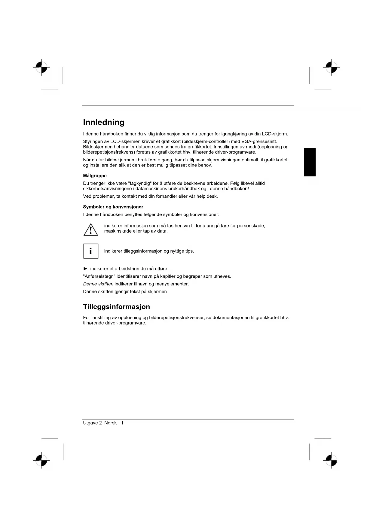 For innstilling av oppløsning og bilderepetisjonsfrekvenser, se dokumentasjonen til grafikkortet hhv.