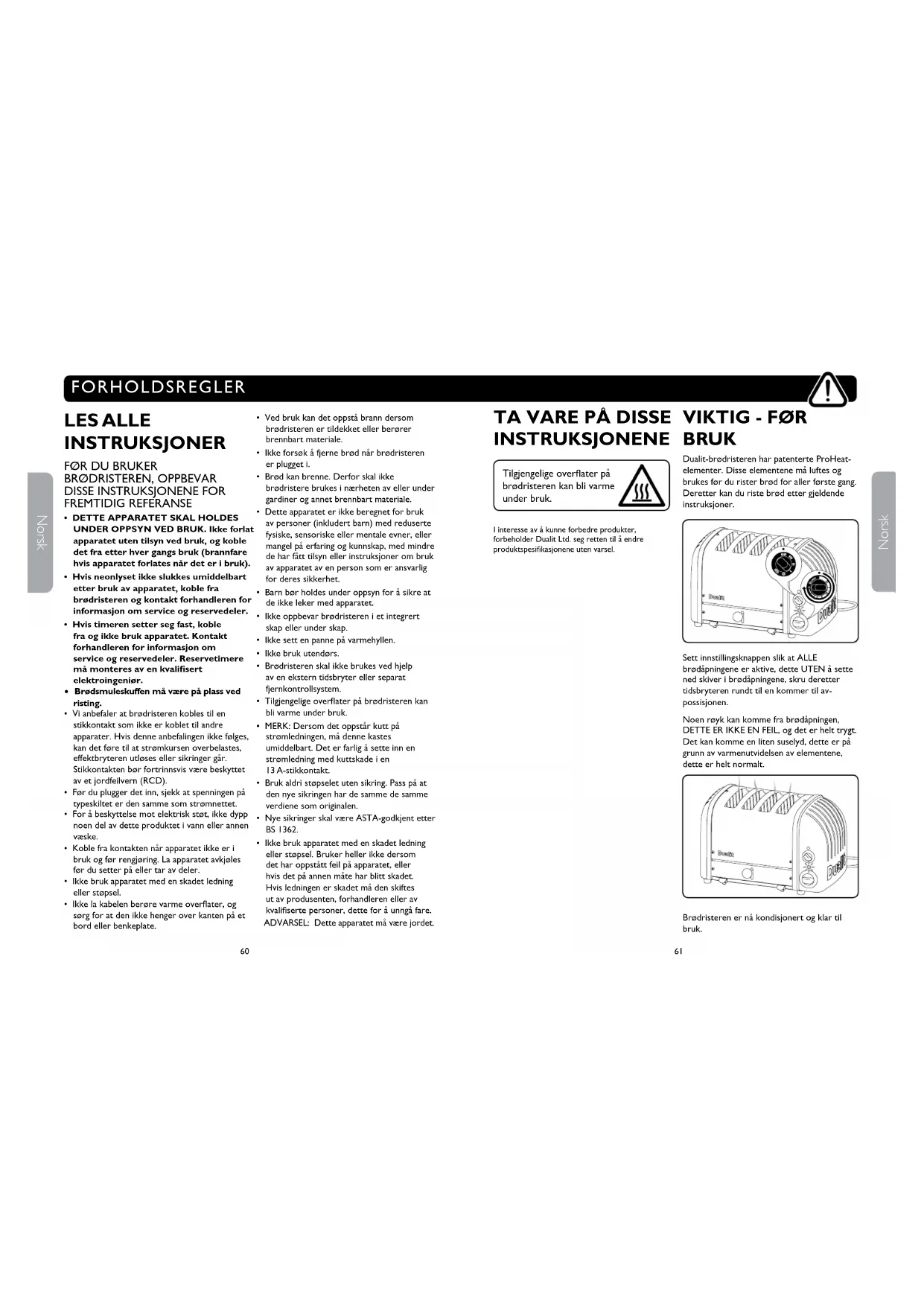 INSTRUKSJONENE Tilgjengelige overater på brødristeren kan bli varme under bruk. I interesse av å kunne forbedre produkter, forbeholder Dualit Ltd. seg retten til å endre produktspesikasjonene uten varsel.
