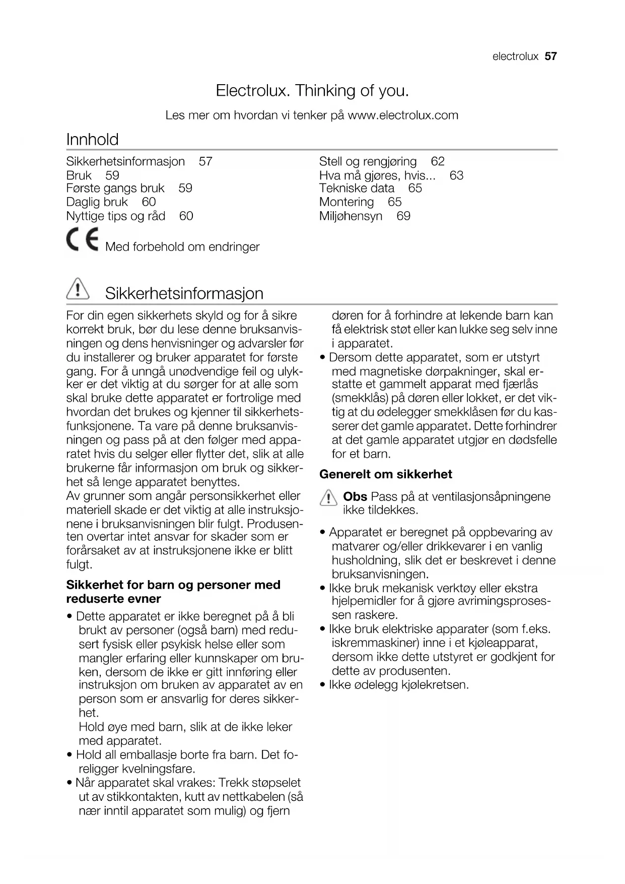 electrolux 57• Kjølekretsen i apparatet er fylt med kjøle-