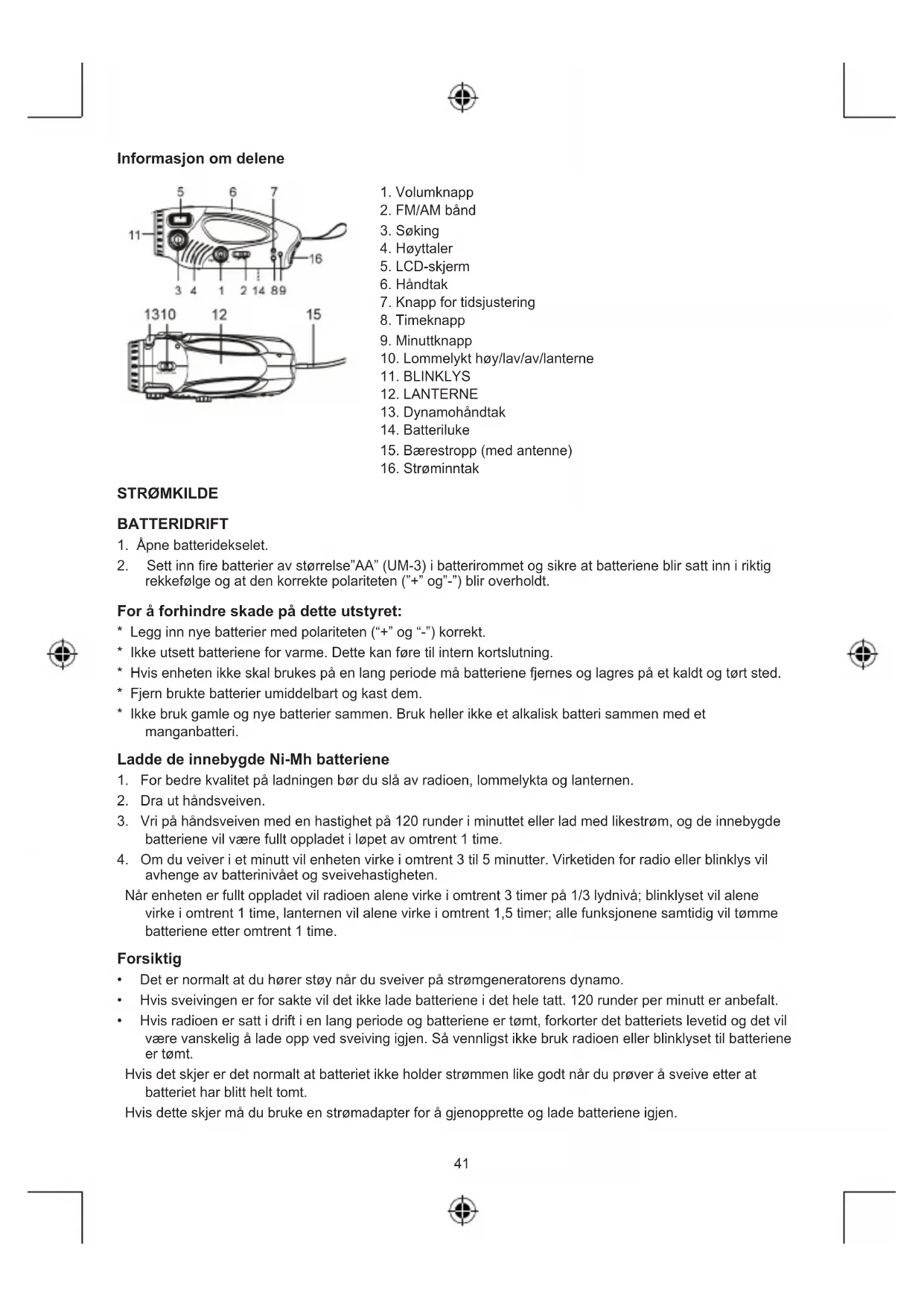 avhenge av batterinivået og sveivehastigheten. Når enheten er fullt oppladet vil radioen alene virke i omtrent 3 timer på 1/3 lydnivå; blinklyset vil alene virke i omtrent 1 time, lanternen vil alene virke i omtrent 1,5 timer; alle funksjonene samtidig vil tømme batteriene etter omtrent 1 time. Forsiktig
