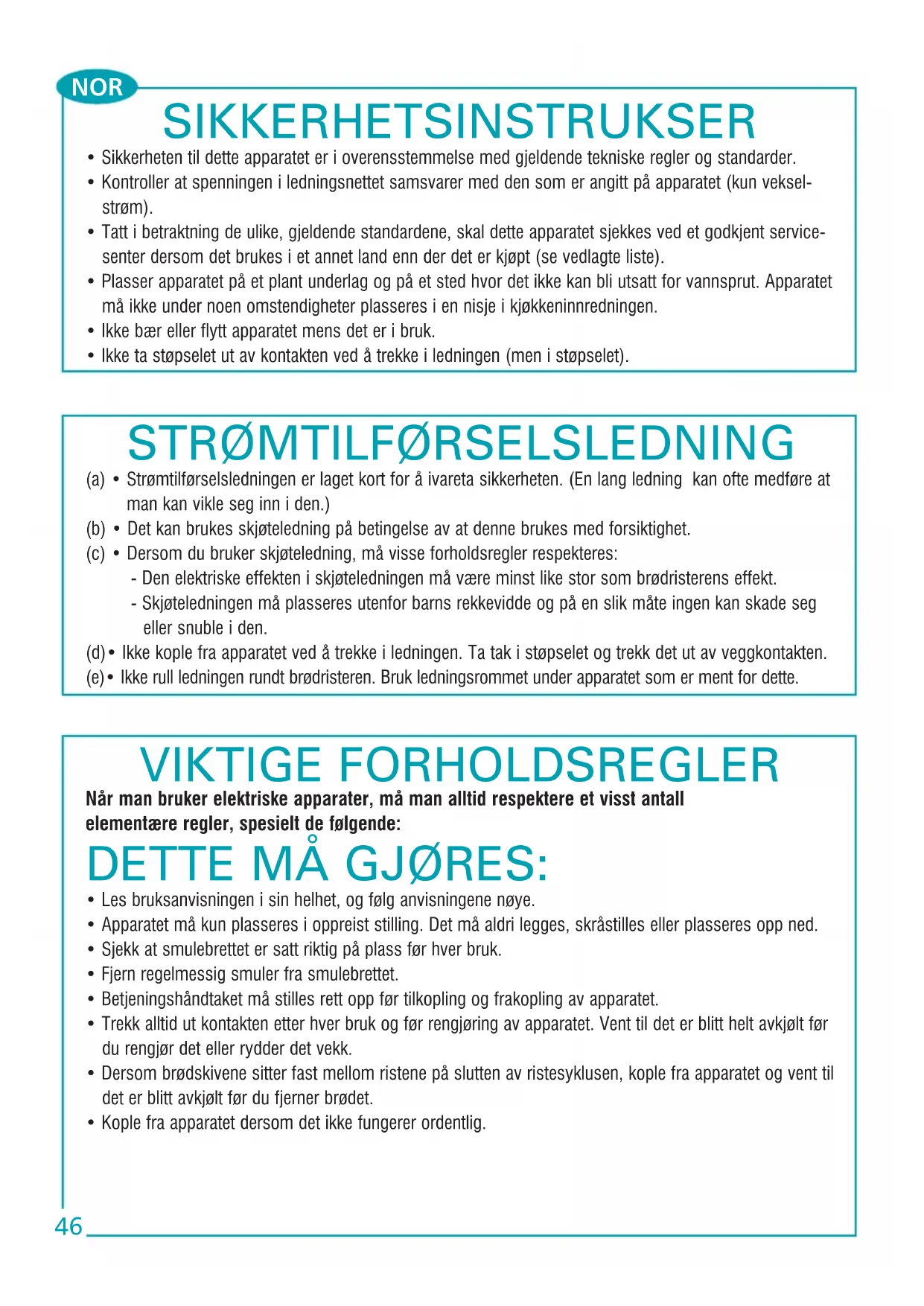 (a) • Strømtilførselsledningen er laget kort for å ivareta sikkerheten. (En lang ledning kan ofte medføre at man kan vikle seg inn i den.) (b) • Det kan brukes skjøteledning på betingelse av at denne brukes med forsiktighet. (c) • Dersom du bruker skjøteledning, må visse forholdsregler respekteres: - Den elektriske effekten i skjøteledningen må være minst like stor som brødristerens effekt. - Skjøteledningen må plasseres utenfor barns rekkevidde og på en slik måte ingen kan skade seg eller snuble i den. (d)• Ikke kople fra apparatet ved å trekke i ledningen. Ta tak i støpselet og trekk det ut av veggkontakten. (e)• Ikke rull ledningen rundt brødristeren. Bruk ledningsrommet under apparatet som er ment for dette. VIKTIGE FORHOLDSREGLER Når man bruker elektriske apparater, må man alltid respektere et visst antall elementære regler, spesielt de følgende: DETTE MÅ GJØRES: