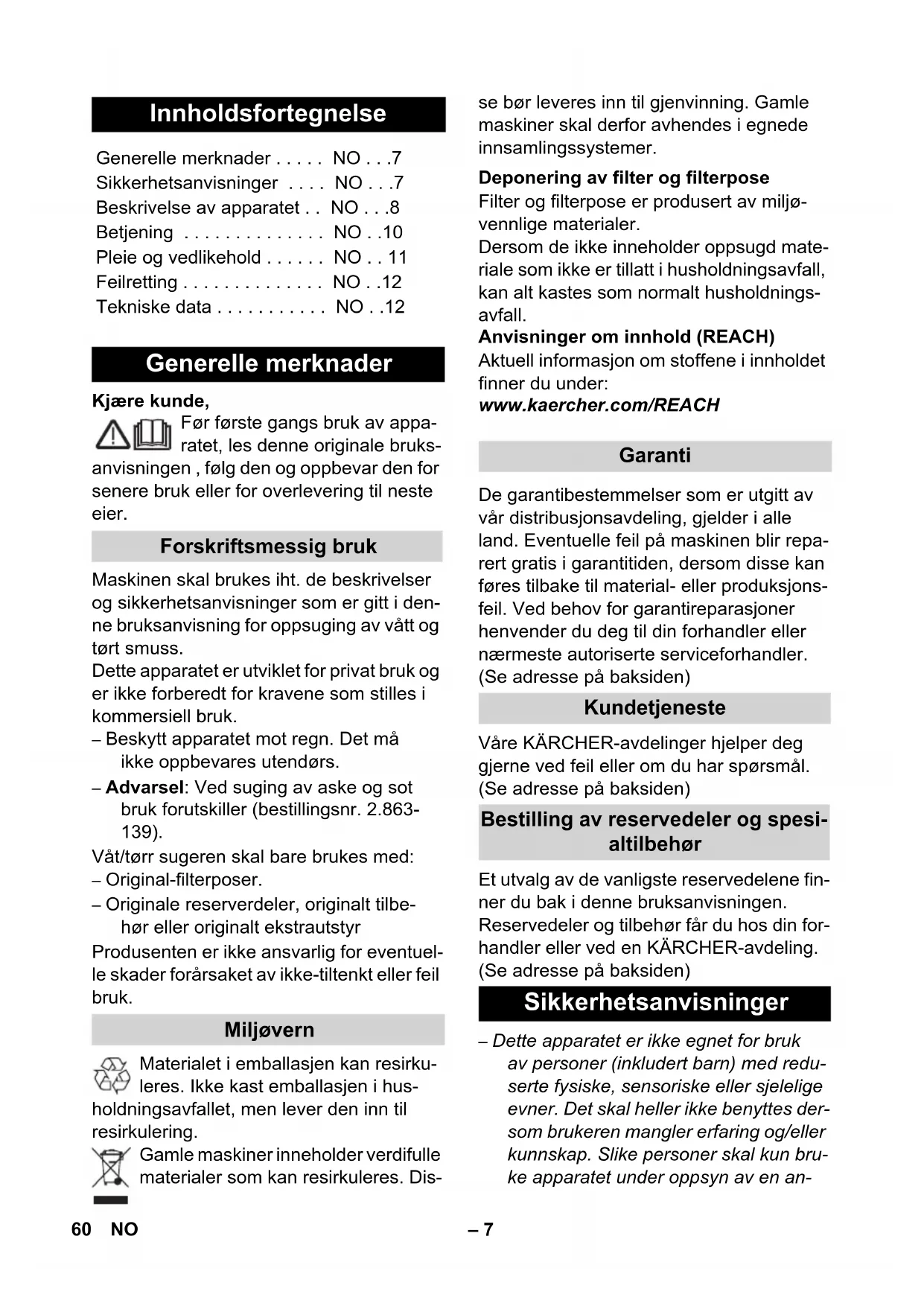 - J 1 Tekniske data Spænding Ydelse P nom. Ydelse P maks. Stikdåsens maks. kapacitet Netsikring (træg) Beholdervolumen Vandindtag med håndgreb Vandindtag med gulvdyse Netkabel Lydtryksniveau (EN 60704-2-1) Vægt (uden tilbehør) 59DA– 7 Kjære kunde, Før første gangs bruk av appa- ratet, les denne originale bruks- anvisningen , følg den og oppbevar den for senere bruk eller for overlevering til neste eier. Maskinen skal brukes iht. de beskrivelser og sikkerhetsanvisninger som er gitt i den- ne bruksanvisning for oppsuging av vått og tørt smuss. Dette apparatet er utviklet for privat bruk og er ikke forberedt for kravene som stilles i kommersiell bruk. – Beskytt apparatet mot regn. Det må ikke oppbevares utendørs. – Advarsel: Ved suging av aske og sot bruk forutskiller (bestillingsnr. 2.863- 139). Våt/tørr sugeren skal bare brukes med: – Original-filterposer. – Originale reserverdeler, originalt tilbe- hør eller originalt ekstrautstyr Produsenten er ikke ansvarlig for eventuel- le skader forårsaket av ikke-tiltenkt eller feil bruk. Materialet i emballasjen kan resirku- leres. Ikke kast emballasjen i hus- holdningsavfallet, men lever den inn til resirkulering. Gamle maskiner inneholder verdifulle materialer som kan resirkuleres. Dis- se bør leveres inn til gjenvinning. Gamle maskiner skal derfor avhendes i egnede innsamlingssystemer. Filter og filterpose er produsert av miljø- vennlige materialer. Dersom de ikke inneholder oppsugd mate- riale som ikke er tillatt i husholdningsavfall, kan alt kastes som normalt husholdnings- avfall. Anvisninger om innhold (REACH) Aktuell informasjon om stoffene i innholdet finner du under: www.kaercher.com/REACH De garantibestemmelser som er utgitt av vår distribusjonsavdeling, gjelder i alle land. Eventuelle feil på maskinen blir repa- rert gratis i garantitiden, dersom disse kan føres tilbake til material- eller produksjons- feil. Ved behov for garantireparasjoner henvender du deg til din forhandler eller nærmeste autoriserte serviceforhandler. (Se adresse på baksiden) Våre KÄRCHER-avdelinger hjelper deg gjerne ved feil eller om du har spørsmål. (Se adresse på baksiden) Et utvalg av de vanligste reservedelene fin- ner du bak i denne bruksanvisningen. Reservedeler og tilbehør får du hos din for- handler eller ved en KÄRCHER-avdeling. (Se adresse på baksiden) – Dette apparatet er ikke egnet for bruk av personer (inkludert barn) med redu- serte fysiske, sensoriske eller sjelelige evner. Det skal heller ikke benyttes der- som brukeren mangler erfaring og/eller kunnskap. Slike personer skal kun bru- ke apparatet under oppsyn av en an- Innholdsfortegnelse Generelle merknader