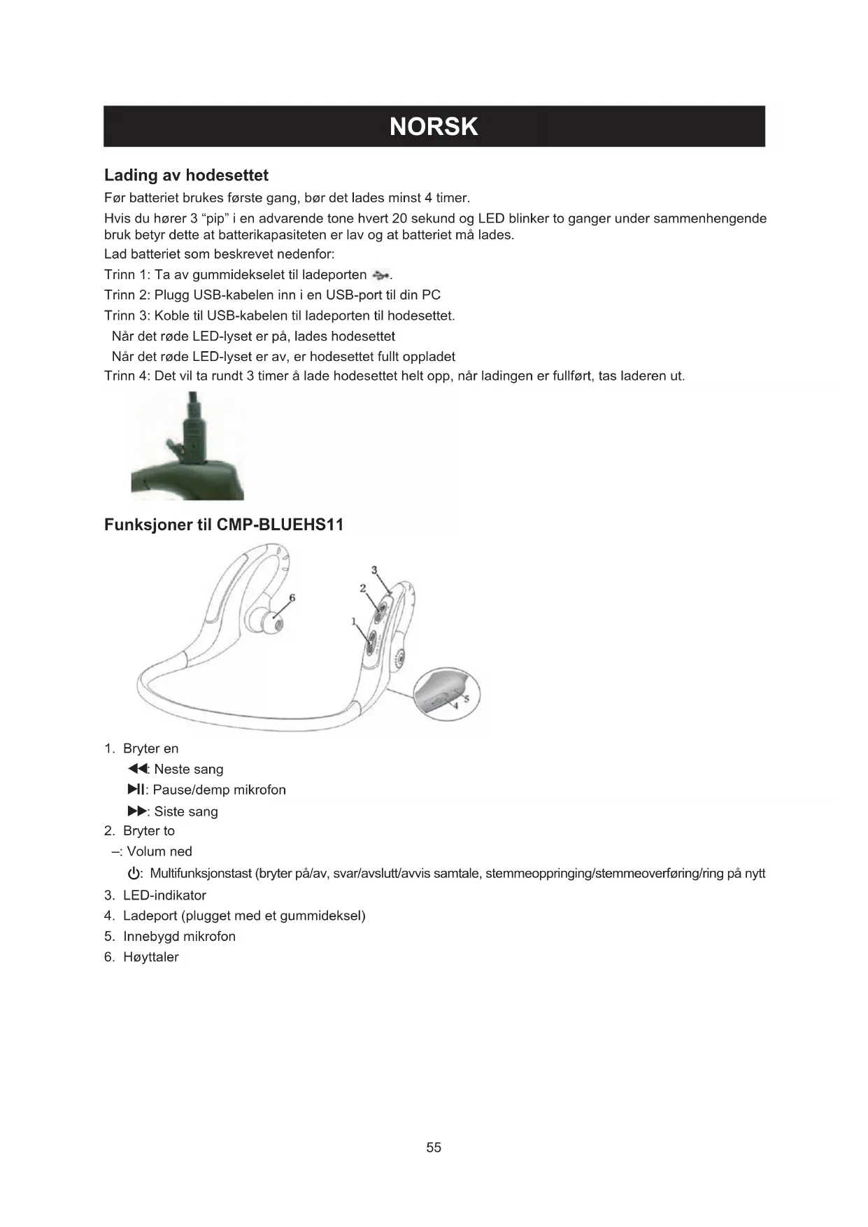 Trinn 2: Plugg USB-kabelen inn i en USB-port til din PC Trinn 3: Koble til USB-kabelen til ladeporten til hodesettet. Når det røde LED-lyset er på, lades hodesettet Når det røde LED-lyset er av, er hodesettet fullt oppladet Trinn 4: Det vil ta rundt 3 timer å lade hodesettet helt opp, når ladingen er fullført, tas laderen ut. Funksjoner til CMP-BLUEHS11