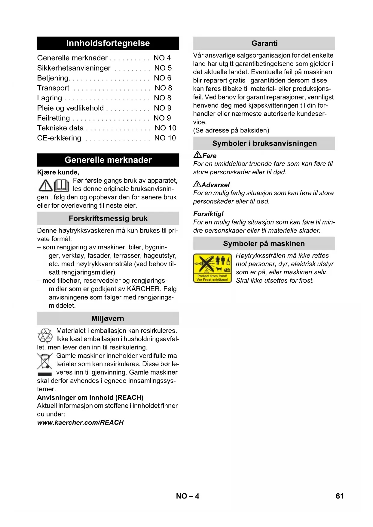 89 dB(A) EU-overensstemmelseserklæring Produkt: Højtryksrenser Type: 1.674-xxx Gældende EF-direktiver 2006/42/EF (+2009/127/EF) 2004/108/EF 2000/14/EF Anvendte harmoniserede standarder EN 55014–1: 2006 + A1: 2009 EN 55014–2: 1997 + A2: 2008 EN 60335–1 EN 60335–2–79 EN 61000–3–2: 2006 + A2: 2009 EN 61000–3–3: 2008 EN 62233: 2008 Anvendte overensstemmelsesvurderings- procedurer 2000/14/EF: Bilag V Lydeffektniveau dB(A) Målt: 86 Garanteret: 89 CEO Head of Approbation 60 DA– 4 Kjære kunde, Før første gangs bruk av apparatet, les denne originale bruksanvisnin- gen , følg den og oppbevar den for senere bruk eller for overlevering til neste eier. Denne høytrykksvaskeren må kun brukes til pri- vate formål: – som rengjøring av maskiner, biler, bygnin- ger, verktøy, fasader, terrasser, hageutstyr, etc. med høytrykkvannstråle (ved behov til- satt rengjøringsmidler) – med tilbehør, reservedeler og rengjørings- midler som er godkjent av KÄRCHER. Følg anvisningene som følger med rengjørings- middelet. Materialet i emballasjen kan resirkuleres. Ikke kast emballasjen i husholdningsavfal- let, men lever den inn til resirkulering. Gamle maskiner inneholder verdifulle ma- terialer som kan resirkuleres. Disse bør le- veres inn til gjenvinning. Gamle maskiner skal derfor avhendes i egnede innsamlingssys- temer. Anvisninger om innhold (REACH) Aktuell informasjon om stoffene i innholdet finner du under: www.kaercher.com/REACH Vår ansvarlige salgsorganisasjon for det enkelte land har utgitt garantibetingelsene som gjelder i det aktuelle landet. Eventuelle feil på maskinen blir reparert gratis i garantitiden dersom disse kan føres tilbake til material- eller produksjons- feil. Ved behov for garantireparasjoner, vennligst henvend deg med kjøpskvitteringen til din for- handler eller nærmeste autoriserte kundeser- vice. (Se adresse på baksiden) Fare For en umiddelbar truende fare som kan føre til store personskader eller til død. 몇 Advarsel For en mulig farlig situasjon som kan føre til store personskader eller til død. Forsiktig! For en mulig farlig situasjon som kan føre til min- dre personskader eller til materielle skader. Høytrykksstrålen må ikke rettes mot personer, dyr, elektrisk utstyr som er på, eller maskinen selv. Skal ikke utsettes for frost. Innholdsfortegnelse Generelle merknader . . . . . . . . . . NO 4 Sikkerhetsanvisninger . . . . . . . . . NO 5 Betjening. . . . . . . . . . . . . . . . . . . . NO 6 Transport . . . . . . . . . . . . . . . . . . . NO 8 Lagring . . . . . . . . . . . . . . . . . . . . . NO 8 Pleie og vedlikehold . . . . . . . . . . . NO 9 Feilretting . . . . . . . . . . . . . . . . . . . NO 9 Tekniske data . . . . . . . . . . . . . . . . NO 10 CE-erklæring . . . . . . . . . . . . . . . . NO 10 Generelle merknader Forskriftsmessig bruk Miljøvern Garanti Symboler i bruksanvisningen Symboler på maskinen 61NO– 5 Fare Ta aldri i støpselet eller stikkontakten med våte hender. Ikke bruk høystrykksvaskeren når strømled- ningen eller andre viktige deler, f. eks. høy- trykkslange, høytrykkpistolen eller sikkerhetsinnretninger er skadet. Kontroller strømledningen og støpselet for skader hver gang høytrykksvaskeren skal brukes. En skadet strømledning må skiftes ut umiddelbart hos autorisert kundeservice eller autorisert elektriker. Kontroller alltid høytrykkslangen for skader før bruk av høytrykksvaskeren. Høytrykkslanger med skader må skiftes ut umiddelbart. Bruk i eksplosjonsfarlige områder er forbudt. Ved bruk av høytrykksvaskeren i risikoområ- der (f.eks. bensinstasjoner) må gjeldende sikkerhetsforskrifter følges. Høytrykkstråler kan være farlige ved feil bruk. Strålen må ikke rettes mot personer, dyr, elektrisk utstyr som er på, eller høy- trykksvaskeren selv. Ikke rett høytrykkstrålen mot deg selv eller andre for å rengjøre klær eller skotøy. Ikke spyl gjenstander som inneholder helse- skadelige materialer (f. eks. asbest). Dekk og ventiler på kjøretøy kan skades med høytrykkstrålen, noe som kan føre til at dekk ek- sploderer. Første tegn på at dekket er skadet er at det misfarges. Skadde dekk/dekkventiler er livsfarlige. Hold en stråleavstand på minst 30 cm ved rengjøring av dekk! Eksplosjonsfare! Ikke sprut ut brennbare væsker. Sug aldri inn væsker som inneholder løse- midler eller ufortynnede syrer og løsemidler! Eksempler på slike væsker kan være ben- sin, malingstynner og fyringsolje. Sprøytetå- ken er høytantennelig, eksplosiv og giftig. Ikke bruk aceton, ufortynnede syrer og løse- midler, da disse angriper materialet som er brukt i høytrykksvaskeren. 몇 Advarsel Støpsel og kontakt på skjøteledning må være vanntette og skal ikke ligge i vann. Uegnede skjøteledninger kan være farlige. Ved utendørs bruk må det anvendes skjøte- ledninger som er godkjent for dette og mer- ket etter gjeldende regler, og som har tilstrekkelig ledningstverrsnitt: