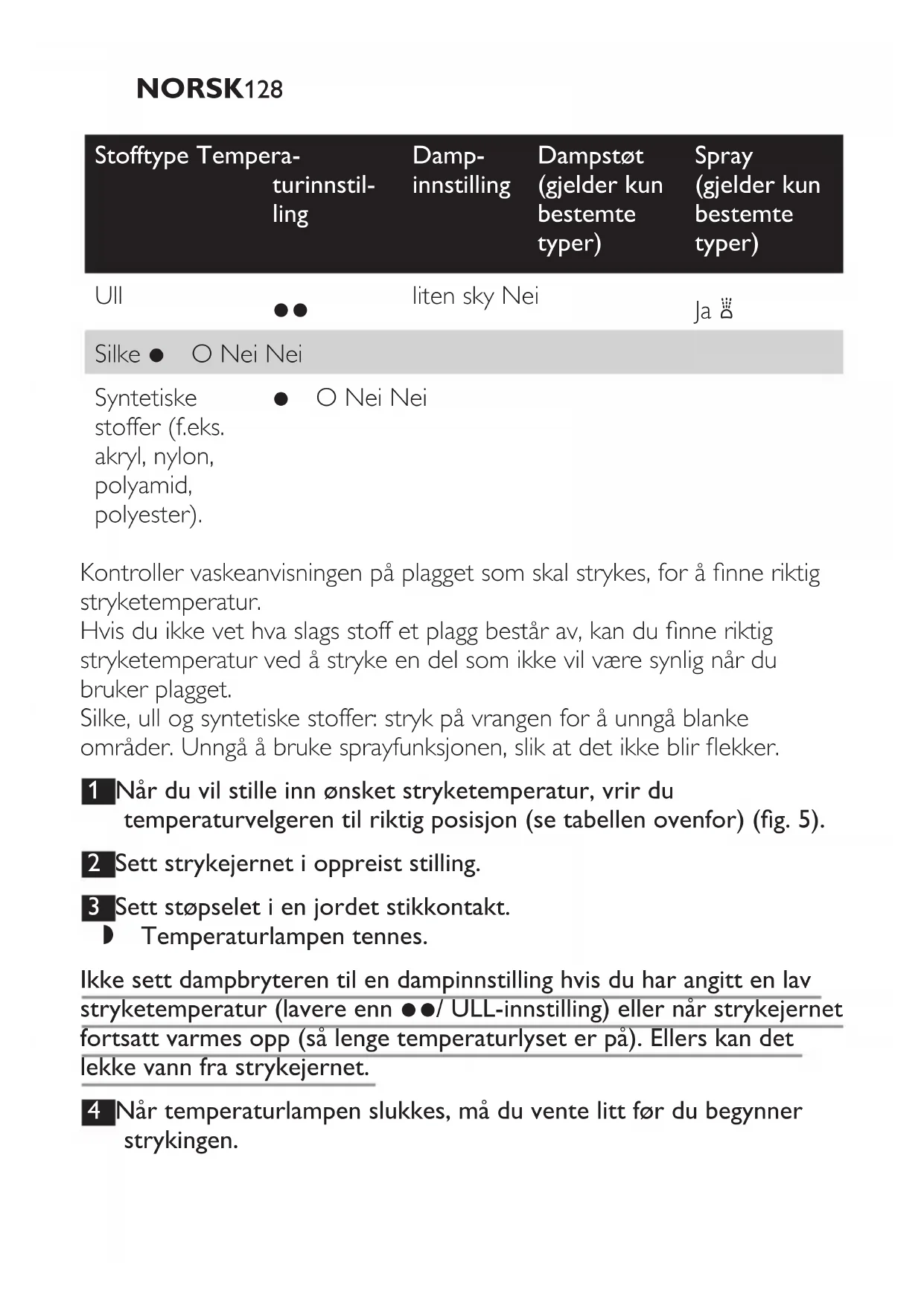 stryketemperatur (lavere enn 2/ ULL-innstilling) eller når strykejernet
