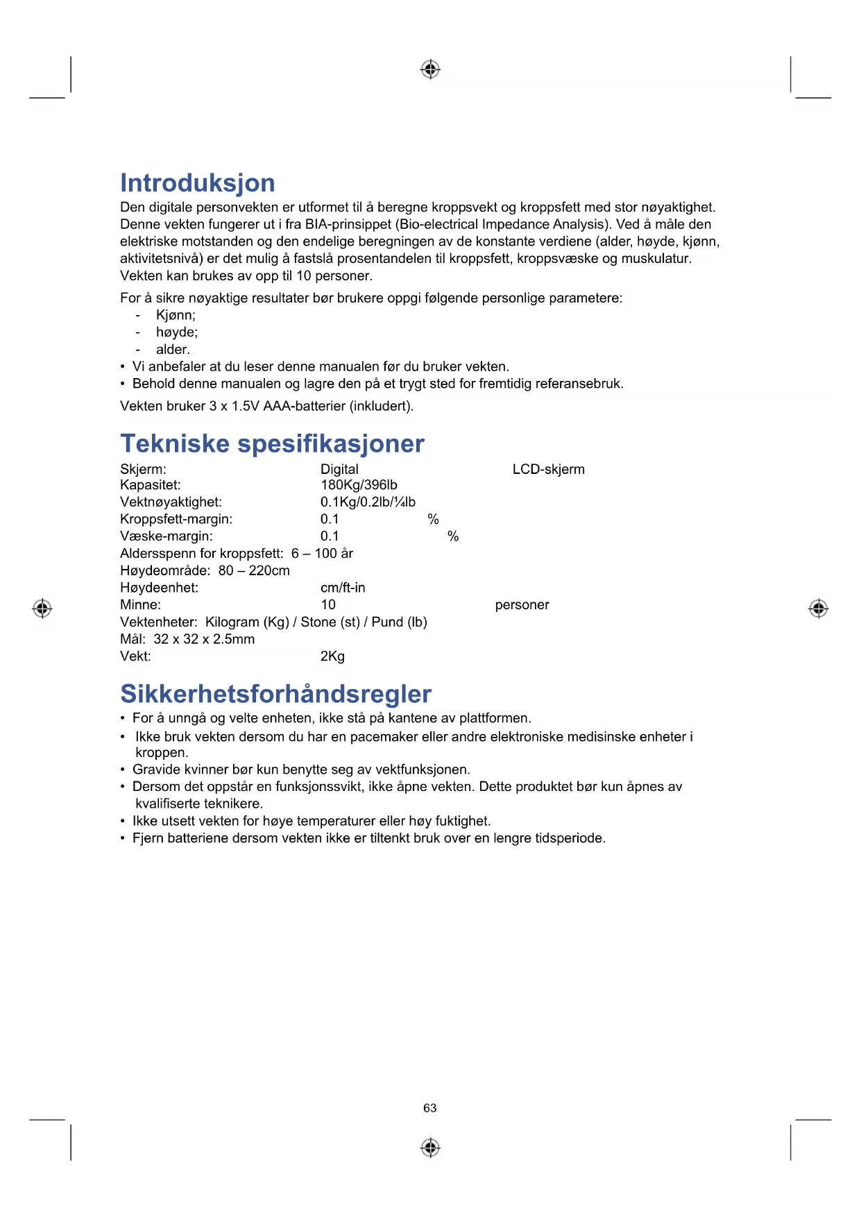 - For mere information, kontakt forhandleren eller den lokale myndighed der er ansvarlig for kontrol af affald.63 Digital personvekt Introduksjon Den digitale personvekten er utformet til å beregne kroppsvekt og kroppsfett med stor nøyaktighet. Denne vekten fungerer ut i fra BIA-prinsippet (Bio-electrical Impedance Analysis). Ved å måle den elektriske motstanden og den endelige beregningen av de konstante verdiene (alder, høyde, kjønn, aktivitetsnivå) er det mulig å fastslå prosentandelen til kroppsfett, kroppsvæske og muskulatur. Vekten kan brukes av opp til 10 personer. For å sikre nøyaktige resultater bør brukere oppgi følgende personlige parametere: - Kjønn; - høyde; - alder.