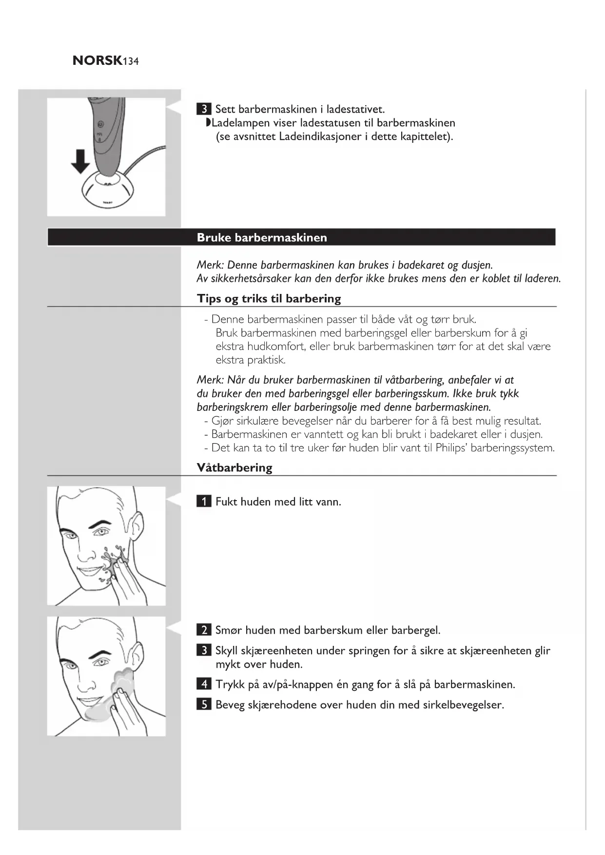 5 sec. NORSK 141Resirkulering - Dette symbolet på et produkt betyr at produktet omfattes av EU-direktiv 2012/19/EU. - Dette symbolet betyr at produktet inneholder et innebygd oppladbart batteri som omfattes av EU-direktiv 2006/66/EF, og som ikke kan avhendes i vanlig husholdningsavfall. Vi anbefaler deg å ta med produktet til et offentlig innsamlingssted eller til et Philips-servicesenter, slik at det oppladbare batteriet kan fjernes av en faglært. - Gjør deg kjent med lokale innsamlingsordninger for elektriske og elektroniske produkter og oppladbare batterier. Følg lokale bestemmelser, og kast aldri produktet og de oppladbare batteriene som vanlig restavfall. Riktig deponering av gamle produkter og oppladbare batterier bidrar til å forhindre negative konsekvenser for helse og miljø. Fjerne det oppladbare barbermaskinbatteriet Det oppladbare batteriet skal bare tas ut når du avhender barbermaskinen. Kontroller at batteriet er helt utladet når du fjerner det. 1 Løsne skruene på baksiden av barbermaskinen og bakerst i skjeggkammeret. 2 Ta av frontpanelet og bakpanelet. 3 Bøy de seks krokene til siden for å ta ut drivverket. Vær forsiktig. Krokene er skarpe. 4 Ta ut det oppladbare batteriet. Garanti og støtte Hvis du trenger kundestøtte eller informasjon, kan du gå til www.philips.com/support eller lese i garantiheftet. Begrensninger i garantien Skjærehodene (kniver og lamelltopper) dekkes ikke av vilkårene i den internasjonale garantien fordi de er slitedeler. Feilsøking Dette avsnittet gir en oppsummering av de vanligste problemene som kan oppstå med apparatet. Hvis du ikke kan løse problemet ved hjelp av informasjonen nedenfor, kan du gå til www.philips.com/support for å se en liste over vanlige spørsmål, eller du kan kontakte forbrukerstøtten i landet der du bor. NORSK142Problem Mulig årsak Løsning Barbermaskinen barberer ikke så godt som den gjorde tidligere. Skjærehodene er ødelagte eller utslitte. Bytt skjærehodene (se avsnittet Utskifting). Barberskum og barbergel blokkerer skjærehodene. Skyll skjæreenheten under springen i varmt vann (se avsnittet Rengjøring og vedlikehold). Lange hår dekker skjærehodene. Rengjør skjærehodene én etter én (se avsnittet Rengjøring og vedlikehold). Du har ikke satt skjærehodene riktig inn. Kontroller at skjærehodene sitter godt på plass i fordypningene (se avsnittet Rengjøring og vedlikehold). Barbermaskinen virker ikke når jeg trykker på av/på-knappen. Det oppladbare batteriet er utladet. Lad opp batteriet (se avsnittet Lading). Temperaturen på barbermaskinen er for høy. I dette tilfellet fungerer ikke barbermaskinen. Så snart temperaturen på barbermaskinen er tilstrekkelig redusert, kan du slå på barbermaskinen igjen. Barbermaskinen virker ikke selv om den er koblet til strømkontakten. Barbermaskinen er ikke laget for å kunne brukes mens den er koblet til strømkontakten. Lad opp batteriet (se avsnittet Lading) og koble det fra strømkontakten.
