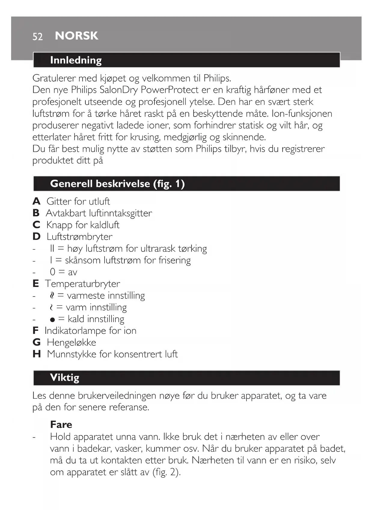 Hvis ledningen er ødelagt, må den alltid skiftes ut av Philips, et