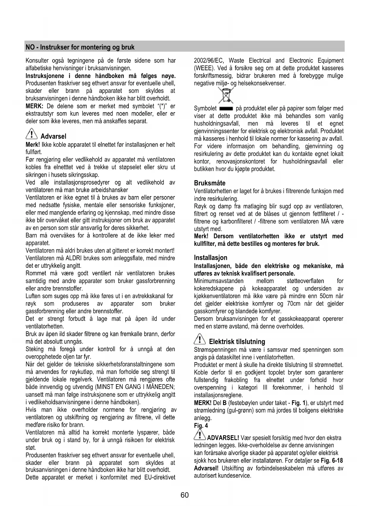 Merk! Ikke koble apparatet til elnettet før installasjonen er helt