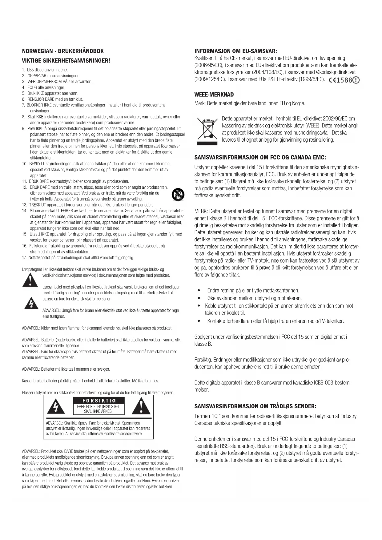 ADVARSEL: Unngå fare for brann eller elektrisk støt ved ikke å utsette apparatet for regn