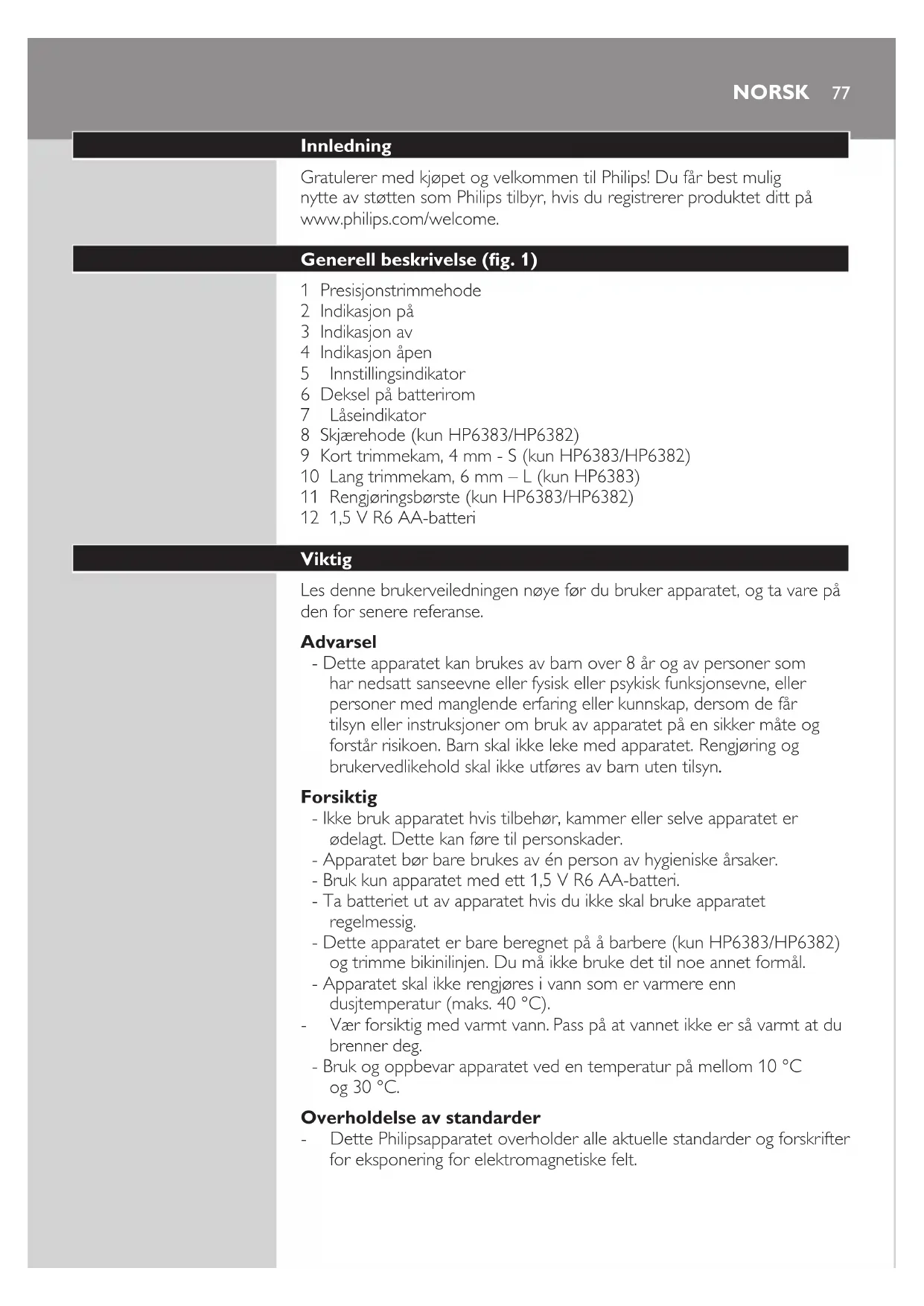 - Dette Philips apparatet overholder alle aktuelle standarder og forskrifter