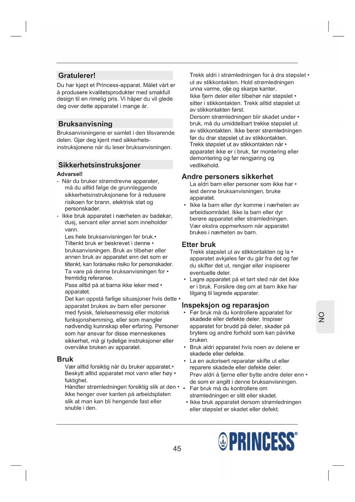 Gratulerer! Du har kjøpt et Princess-apparat. Målet vårt er å produsere kvalitetsprodukter med smakfull design til en rimelig pris. Vi håper du vil glede deg over dette apparatet i mange år. Bruksanvisning Bruksanvisningene er samlet i den tilsvarende delen. Gjør deg kjent med sikkerhets- instruksjonene når du leser bruksanvisningen. Sikkerhetsinstruksjoner Advarsel! - Når du bruker strømdrevne apparater, må du alltid følge de grunnleggende sikkerhetsinstruksjonene for å redusere risikoen for brann, elektrisk støt og personskader. - Ikke bruk apparatet i nærheten av badekar, dusj, servant eller annet som inneholder vann. Les hele bruksanvisningen før bruk.• Tiltenkt bruk er beskrevet i denne • bruksanvisningen. Bruk av tilbehør eller annen bruk av apparatet enn det som er tiltenkt, kan forårsake risiko for personskader. Ta vare på denne bruksanvisningen for • fremtidig referanse. Pass alltid på at barna ikke leker med • apparatet. Det kan oppstå farlige situasjoner hvis dette • apparatet brukes av barn eller personer med fysisk, følelsesmessig eller motorisk funksjonshemming, eller som mangler nødvendig kunnskap eller erfaring. Personer som har ansvar for disse menneskenes sikkerhet, må gi tydelige instruksjoner eller overvåke bruken av apparatet. Bruk Vær alltid forsiktig når du bruker apparatet.• Beskytt alltid apparatet mot vann eller høy • fuktighet. Håndter strømledningen forsiktig slik at den • ikke henger over kanten på arbeidsplaten slik at man kan bli hengende fast eller snuble i den. Trekk aldri i strømledningen for å dra støpslet • ut av stikkontakten. Hold strømledningen unna varme, olje og skarpe kanter. Ikke fjern deler eller tilbehør når støpslet • sitter i stikkontakten. Trekk alltid støpslet ut av stikkontakten først. Dersom strømledningen blir skadet under • bruk, må du umiddelbart trekke støpslet ut av stikkontakten. Ikke berør strømledningen før du drar støpslet ut av stikkontakten. Trekk støpslet ut av stikkontakten når • apparatet ikke er i bruk, før montering eller demontering og før rengjøring og vedlikehold. Andre personers sikkerhet La aldri barn eller personer som ikke har • lest denne bruksanvisningen, bruke apparatet. Ikke la barn eller dyr komme i nærheten av • arbeidsområdet. Ikke la barn eller dyr berøre apparatet eller strømledningen. Vær ekstra oppmerksom når apparatet brukes i nærheten av barn. Etter bruk Trekk støpslet ut av stikkontakten og la • apparatet avkjøles før du går fra det og før du skifter det ut, rengjør eller inspiserer eventuelle deler. Lagre apparatet på et tørt sted når det ikke • er i bruk. Forsikre deg om at barn ikke har tilgang til lagrede apparater. Inspeksjon og reparasjon Før bruk må du kontrollere apparatet for • skadede eller defekte deler. Inspiser apparatet for brudd på deler, skader på brytere og andre forhold som kan påvirke bruken. Bruk aldri apparatet hvis noen av delene er • skadede eller defekte. La en autorisert reparatør skifte ut eller • reparere skadede eller defekte deler. Prøv aldri å fjerne eller bytte andre deler enn • de som er angitt i denne bruksanvisningen. Før bruk må du kontrollere om • strømledningen er slitt eller skadet. Ikke bruk apparatet dersom strømledningen • eller støpslet er skadet eller defekt.46