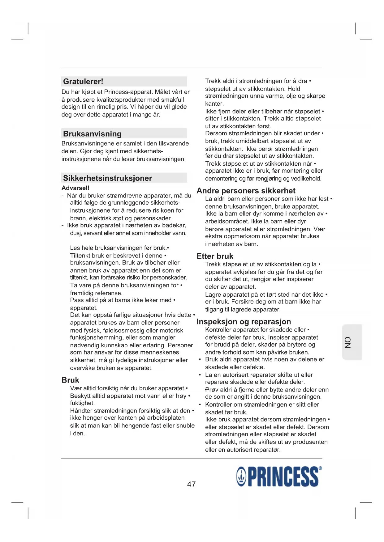 Gratulerer! Du har kjøpt et Princess-apparat. Målet vårt er å produsere kvalitetsprodukter med smakfull design til en rimelig pris. Vi håper du vil glede deg over dette apparatet i mange år. Bruksanvisning Bruksanvisningene er samlet i den tilsvarende delen. Gjør deg kjent med sikkerhets- instruksjonene når du leser bruksanvisningen. Sikkerhetsinstruksjoner Advarsel! - Når du bruker strømdrevne apparater, må du alltid følge de grunnleggende sikkerhets- instruksjonene for å redusere risikoen for brann, elektrisk støt og personskader. - Ikke bruk apparatet i nærheten av badekar, dusj, servant eller annet som inneholder vann. Les hele bruksanvisningen før bruk.• Tiltenkt bruk er beskrevet i denne • bruksanvisningen. Bruk av tilbehør eller annen bruk av apparatet enn det som er tiltenkt, kan forårsake risiko for personskader. Ta vare på denne bruksanvisningen for • fremtidig referanse. Pass alltid på at barna ikke leker med • apparatet. Det kan oppstå farlige situasjoner hvis dette • apparatet brukes av barn eller personer med fysisk, følelsesmessig eller motorisk funksjonshemming, eller som mangler nødvendig kunnskap eller erfaring. Personer som har ansvar for disse menneskenes sikkerhet, må gi tydelige instruksjoner eller overvåke bruken av apparatet. Bruk Vær alltid forsiktig når du bruker apparatet.• Beskytt alltid apparatet mot vann eller høy • fuktighet. Håndter strømledningen forsiktig slik at den • ikke henger over kanten på arbeidsplaten slik at man kan bli hengende fast eller snuble i den. Trekk aldri i strømledningen for å dra • støpselet ut av stikkontakten. Hold strømledningen unna varme, olje og skarpe kanter. Ikke fjern deler eller tilbehør når støpselet • sitter i stikkontakten. Trekk alltid støpselet ut av stikkontakten først. Dersom strømledningen blir skadet under • bruk, trekk umiddelbart støpselet ut av stikkontakten. Ikke berør strømledningen før du drar støpselet ut av stikkontakten. Trekk støpselet ut av stikkontakten når • apparatet ikke er i bruk, før montering eller demontering og før rengjøring og vedlikehold. Andre personers sikkerhet La aldri barn eller personer som ikke har lest • denne bruksanvisningen, bruke apparatet. Ikke la barn eller dyr komme i nærheten av • arbeidsområdet. Ikke la barn eller dyr berøre apparatet eller strømledningen. Vær ekstra oppmerksom når apparatet brukes i nærheten av barn. Etter bruk Trekk støpselet ut av stikkontakten og la • apparatet avkjøles før du går fra det og før du skifter det ut, rengjør eller inspiserer deler av apparatet. Lagre apparatet på et tørt sted når det ikke • er i bruk. Forsikre deg om at barn ikke har tilgang til lagrede apparater. Inspeksjon og reparasjon Kontroller apparatet for skadede eller • defekte deler før bruk. Inspiser apparatet for brudd på deler, skader på brytere og andre forhold som kan påvirke bruken. Bruk aldri apparatet hvis noen av delene er • skadede eller defekte. La en autorisert reparatør skifte ut eller • reparere skadede eller defekte deler. Prøv aldri å fjerne eller bytte andre deler enn • de som er angitt i denne bruksanvisningen. Kontroller om strømledningen er slitt eller • skadet før bruk. Ikke bruk apparatet dersom strømledningen • eller støpselet er skadet eller defekt. Dersom strømledningen eller støpselet er skadet eller defekt, må de skiftes ut av produsenten eller en autorisert reparatør.48