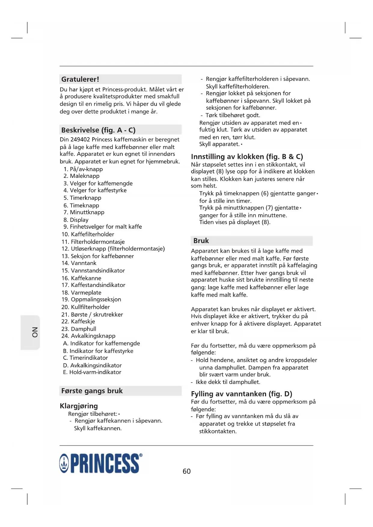 A. Indikator for kaffemengde B. Indikator for kaffestyrke C. Timerindikator D. Avkalkingsindikator E. Hold-varm-indikator Første gangs bruk Klargjøring Rengjør tilbehøret:• - Rengjør kaffekannen i såpevann. Skyll kaffekannen. - Rengjør kaffefilterholderen i såpevann. Skyll kaffefilterholderen. - Rengjør lokket på seksjonen for kaffebønner i såpevann. Skyll lokket på seksjonen for kaffebønner. - Tørk tilbehøret godt. Rengjør utsiden av apparatet med en• fuktig klut. Tørk av utsiden av apparatet med en ren, tørr klut. Skyll apparatet.• Innstilling av klokken (fig. B & C) Når støpselet settes inn i en stikkontakt, vil displayet (8) lyse opp for å indikere at klokken kan stilles. Klokken kan justeres senere når som helst. Trykk på timeknappen (6) gjentatte ganger• for å stille inn timer. Trykk på minuttknappen (7) gjentatte• ganger for å stille inn minuttene. Tiden vises på displayet (8). Bruk Apparatet kan brukes til å lage kaffe med kaffebønner eller med malt kaffe. Før første gangs bruk, er apparatet innstilt på kaffelaging med kaffebønner. Etter hver gangs bruk vil apparatet huske sist brukte innstilling til neste gang: lage kaffe med kaffebønner eller lage kaffe med malt kaffe. Apparatet kan brukes når displayet er aktivert. Hvis displayet ikke er aktivert, trykker du på enhver knapp for å aktivere displayet. Apparatet er klar til bruk. Før du fortsetter, må du være oppmerksom på følgende: - Hold hendene, ansiktet og andre kroppsdeler unna damphullet. Dampen fra apparatet blir svært varm under bruk. - Ikke dekk til damphullet. Fylling av vanntanken (fig. D) Før du fortsetter, må du være oppmerksom på følgende: - Før fylling av vanntanken må du slå av apparatet og trekke ut støpselet fra stikkontakten.61