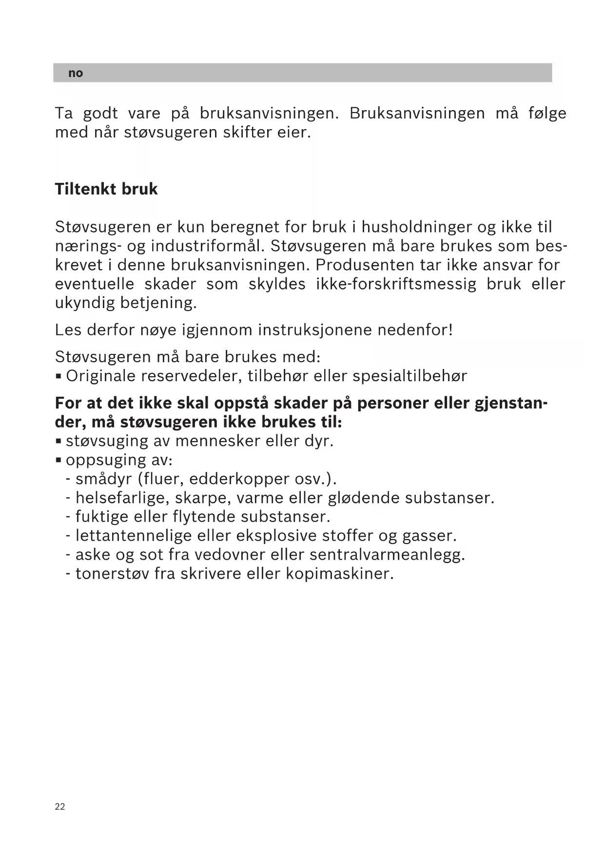 Ta godt vare på bruksanvisningen. Bruksanvisningen må følge med når støvsugeren skifter eier. Tiltenkt bruk Støvsugeren er kun beregnet for bruk i husholdninger og ikke til nærings- og industriformål. Støvsugeren må bare brukes som bes- krevet i denne bruksanvisningen. Produsenten tar ikke ansvar for eventuelle skader som skyldes ikke-forskriftsmessig bruk eller ukyndig betjening. Les derfor nøye igjennom instruksjonene nedenfor! Støvsugeren må bare brukes med: Originale reservedeler, tilbehør eller spesialtilbehør For at det ikke skal oppstå skader på personer eller gjenstan- der, må støvsugeren ikke brukes til: støvsuging av mennesker eller dyr. oppsuging av: - smådyr (fluer, edderkopper osv.). - helsefarlige, skarpe, varme eller glødende substanser. - fuktige eller flytende substanser. - lettantennelige eller eksplosive stoffer og gasser. - aske og sot fra vedovner eller sentralvarmeanlegg. - tonerstøv fra skrivere eller kopimaskiner.de