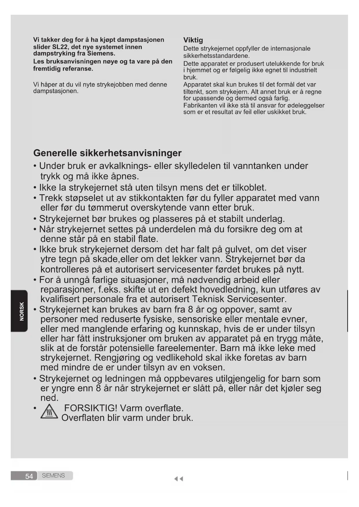 S I E M E N S NORSK Vi takker deg for å ha kjøpt dampstasjonen