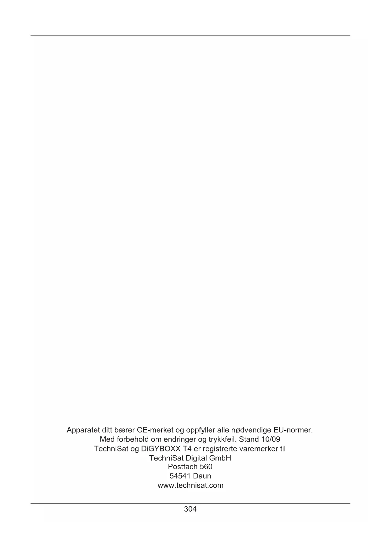 SCART-kontakt VCR DC-inngang HDMI- utgang Antenne utgang USB- kontakt Audio-utganger analog Audioutgang digital (elektrisk) Programvalg opp/ned På/standby LED visning307 Kjære kunde, gratulerer med din nye digitale mottaker DiGYBOXX T4. Denne bruksanvisningen skal hjelpe deg med å bruke de omfangsrike funksjonene til din nye digitale mottaker optimalt. Vi har sammenfattet brukshenvisningene så forståelig som mulig, og har forsøkt å holde det så knapt som mulig. Funksjonsomfanget til apparatet ditt utvides stadig gjennom programvareoppdateringer. Gjennom dette kommer det ev. til noen betjeningstrinn, som ennå ikke er forklarte i denne bruksanvisningen eller det funksjoner som finnes kan endres i betjening. På grunn av dette bør du besøke TechniSat hjemmeside, slik at du kan laste ned de aktuelle bruksanvisningene. Vi håper du får mye glede av din TechniSat DiGYBOXX T4! Ditt TechniSat team Teknisk kundestøtte +49 (0) 180-5005-907* *(0,14€/min fra tysk fasttelefon, mobilpriser og utlandssamtaler kan avvike) Dette produktet er beskyttet av copyright som er beskyttet av U.S. patenter og andre besittelsesrettigheter. Bruk av denne copyright beskyttelsesteknologien må autoriseres av Macrovision, og er tiltenkt hjemmebruk og annen begrenset bruk, hvis ikke annet er autorisert av Macrovision. Brudd på dette eller demontering er forbudt.3 Les først > Før du tar apparatet i bruk, må du se til at leveringen er komplett. Leveringen inneholder: 1 digital mottaker, 1 nettadapter, 1 fjernkontroll, 2 batterier (1,5 V mikrocelle) 1 bruksanvisning-CD-ROM 1 hurtigveiledning, 1 garantikort. > Legg de vedlagte batteriene inn i fjernkontrollen, se til at de legges inn med riktig polaritet som vist i batterirommet.